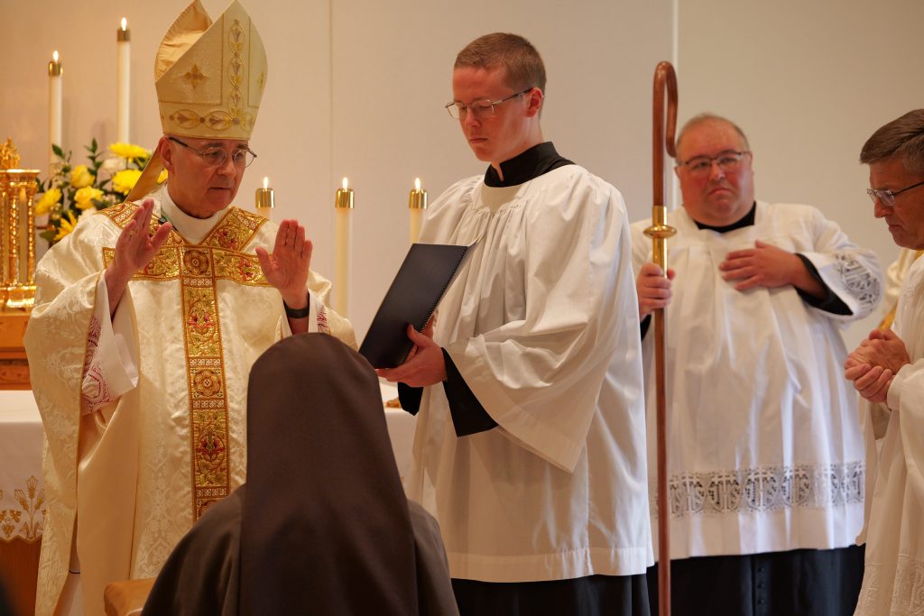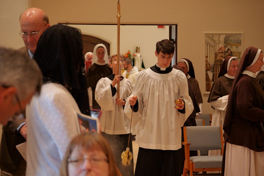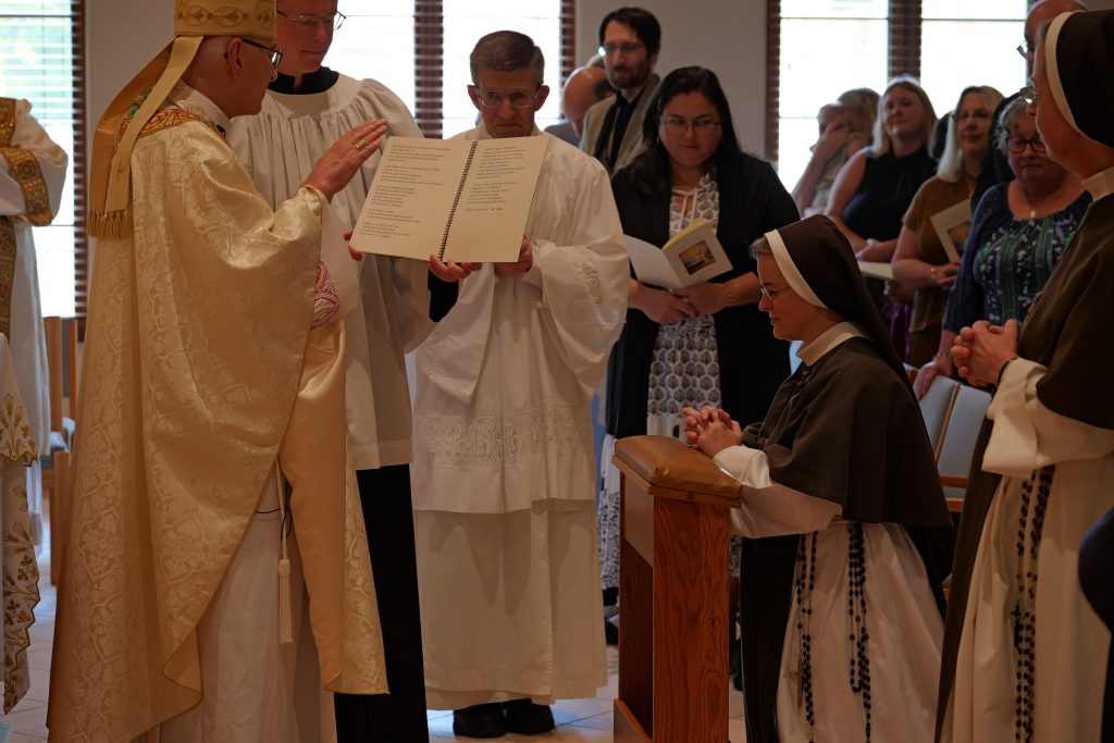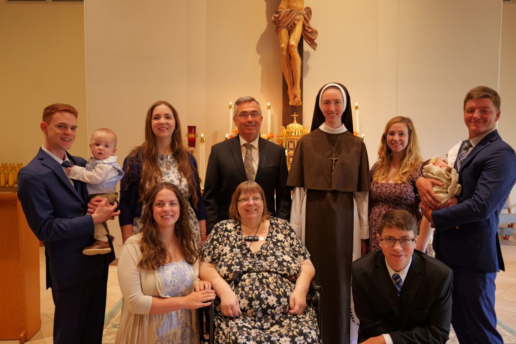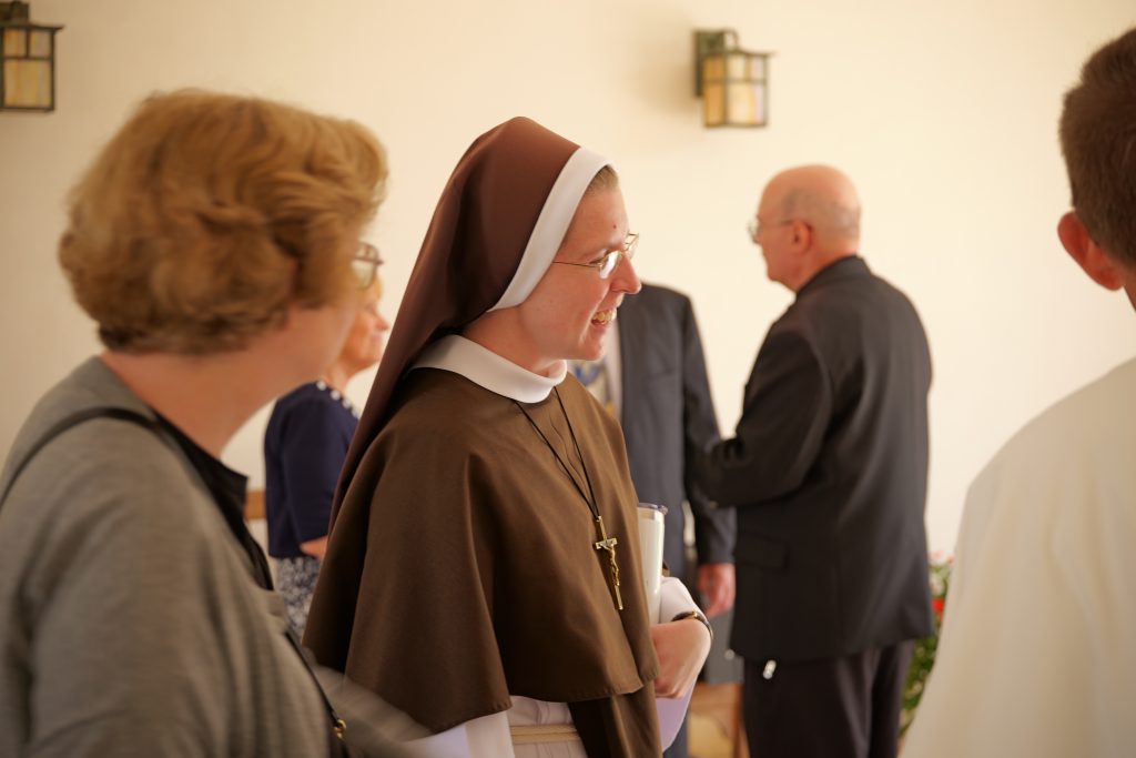 September 11, 2024 Sister Mary Michael’s Final Profession of Vows Last First Saturday, September 7th, anticipating the feast of our Blessed Mother’s Birth, we had the joy of witnessing Sister Mary Michael’s Perpetual Profession! It was a great and joyous celebration, in which we were joined by many family and friends. Sister Mary Michael of the Incarnate Word reflected on her profession in light of Jesus’ presence among us in the Incarnation, “Perpetual vows are amazing, but it is not easy. Jesus never promised easy. He did promise the hundred fold in this life though. What is easy is to miss the fact that the greatest part of the hundred fold is simply that God became Emmanuel, meaning God-with-us. God is always with us. He is with us in the Eucharist, in the Scriptures, wherever two or three are gathered, just to name a few. And in an extraordinarily profound way that goes beyond words, God is always with me as a perpetually professed member of this religious community.” During the Entrance Procession the sisters sing the antiphon, ‘Come, Spouse of Christ, receive the crown the Lord has prepared for you!’During a Profession Mass, the parents of the Sister to be professed traditionally bring the offertory gifts to the altar, as a sign of their giving their daughter to Christ and the ChurchAt a Final Profession, the Bishop says the consecratory prayer over the Sister Four days before final vows, a friend of mine very matter of factly asked me, “Why are you doing this?” As I lay prostrate on the chapel floor that Saturday, on the eve of the Nativity of Our Lady, I realized my full answer to her is, “Because Jesus is worth it, and I wouldn’t want to be anywhere else.” In the nine days leading up to final profession, I prayed for all of your intentions, whether you were here physically or spiritually. And for myself, I prayed that God will continue to increase and I decrease, so that I may one day say, it is no longer I who live, but Christ who lives in me. Before her profession, the Sister prostrates during the Litany of the Saints, beseeching the prayer of the Church in Heaven and on Earth to support her in her vocation. Her scapular is put over her head, representing her death to the world. Deo Gratias! Bishop Raica gave a very inspiring homily, and we include a small portion here: The first reading from the Song of Songs notes the burning ardor of love. It is strong, it is powerful; it cannot be quenched. It does not dissipate easily. It is something which cannot be purchased but discovered as a gift already within. It reveals itself in subtle ways. Yet, it is described as “stern as death”, “relentless”, and a “blazing fire”. How amazing is this gift that, once we stumble upon it, we don’t want it to leave. Rather we become more fascinated, more curious, more attracted, more taken by love because it does not seem to have a beginning or end, but finds its source and summit, its fountain of expression in Jesus, who is love incarnate. So, this first word is “love” – not a tawdry or romanticized or maudlin version of it – but one whose power warms and purifies and is often beyond our intellectual conceptualizations. The second reading from St Paul’s letter from his letter to the Philippians reminds us that this love can only be realized when it is confirmed with faith and conformed to the heart of Christ Himself. Your mind and heart must vibrate in unison with Jesus to make a symphonic, harmonic sound. Often times, our imperfections mar the pristine tone that we were meant to create in the Lord. This short but magnificent letter suggests that we should look after the other as more important than ourselves with compassion and mercy. Only then will the note we play have the right timbre, a sweet quality and authenticity. It brings our love to life. Today, you present yourself, Sr Mary Michael – before God, before Mother Louise Marie and before the sisters of this convent – and all of us – to make your final profession. Be bold. Be strong. Rely on God’s grace and the tender encouragement of our Blessed Mother. Family and friends gathered after Mass to celebrate.