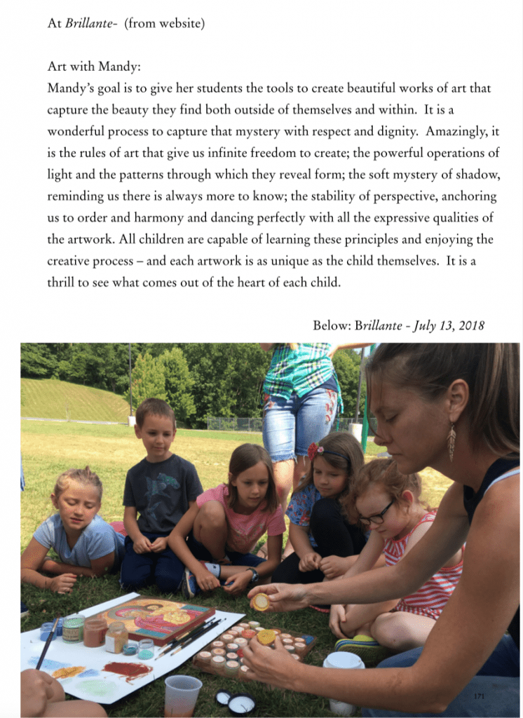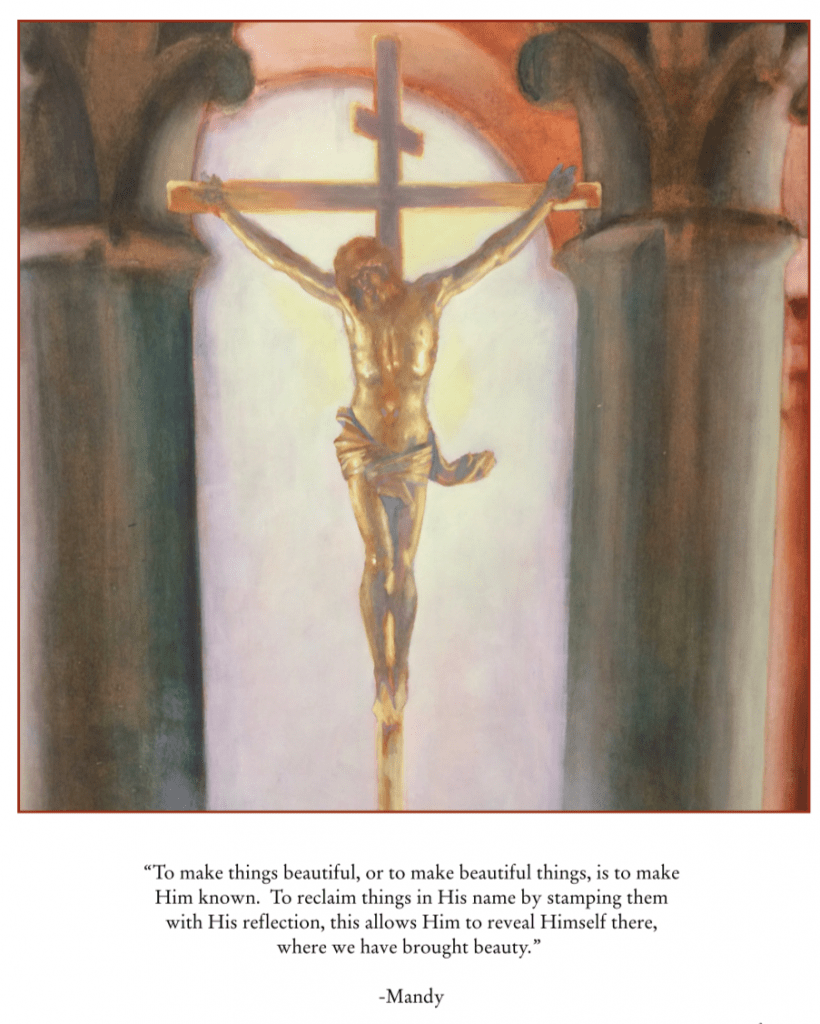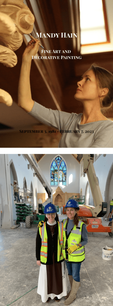 October 18, 2024 “Beauty is not an accessory…” “Beauty is not an accessory. It is a necessity that has transformative, healing, and encouraging power. It brings us to its source and makes us better without effort on our part. It is truly part of God’s order of mercy and redemption in this way.” Mandy Hain A collection of the work of artist Mandy Hain (+2023), longtime friend of our Community and sister of Sister Benedicta Marie, is now available online to view (or purchase in book form). Best known for her sacred art and classes for children, this book is a compilation of Mandy’s work over the years, including sacred art, chapel work, decorative work, portraits, sketches, studies in oil, and her classes with children. Featuring many of her finished works, this collection also includes many of her studies, giving an idea of her artistic process. Quotations for her websites and interviews are also included, communicating Mandy’s approach to art and beauty in her own words. Mandy explained her philosophy of a child’s capacity for beauty, “I believe that beauty is not an accessory to our lives, but a necessity through which we are exposed to the truth, and without it we cannot live fully in the image of the First Artist and Creator, or enjoy life in a fully human way. It is my joy to participate in exposing my students to images of light so that they may continue to recognize true beauty as they grow. I want to share with them the experience of creating beautiful images so that they know that they are able to create beautiful environments wherever they may be. I am always in amazement to see how well they understand what they see, and how creatively they are able to apply what they learn in class to make wonderful works of art. I believe that every child is an artist, because I think that art is a gift with which every person is endowed through their human nature, though it may be expressed in different ways!” After suffering with cancer for several years, Mandy entered eternal life on February 7, 2023. Her last big project was the new Christendom College Chapel of Christ the King in Front Royal, Virginia, dedicated two months after her death. Below is a short ‘Artisan Highlights’ video about this project. photo on left: Mandy shows Sister Benedicta Marie her progress during the chapel’s construction (November 2020) Sample pages from the book of Mandy’s artwork: