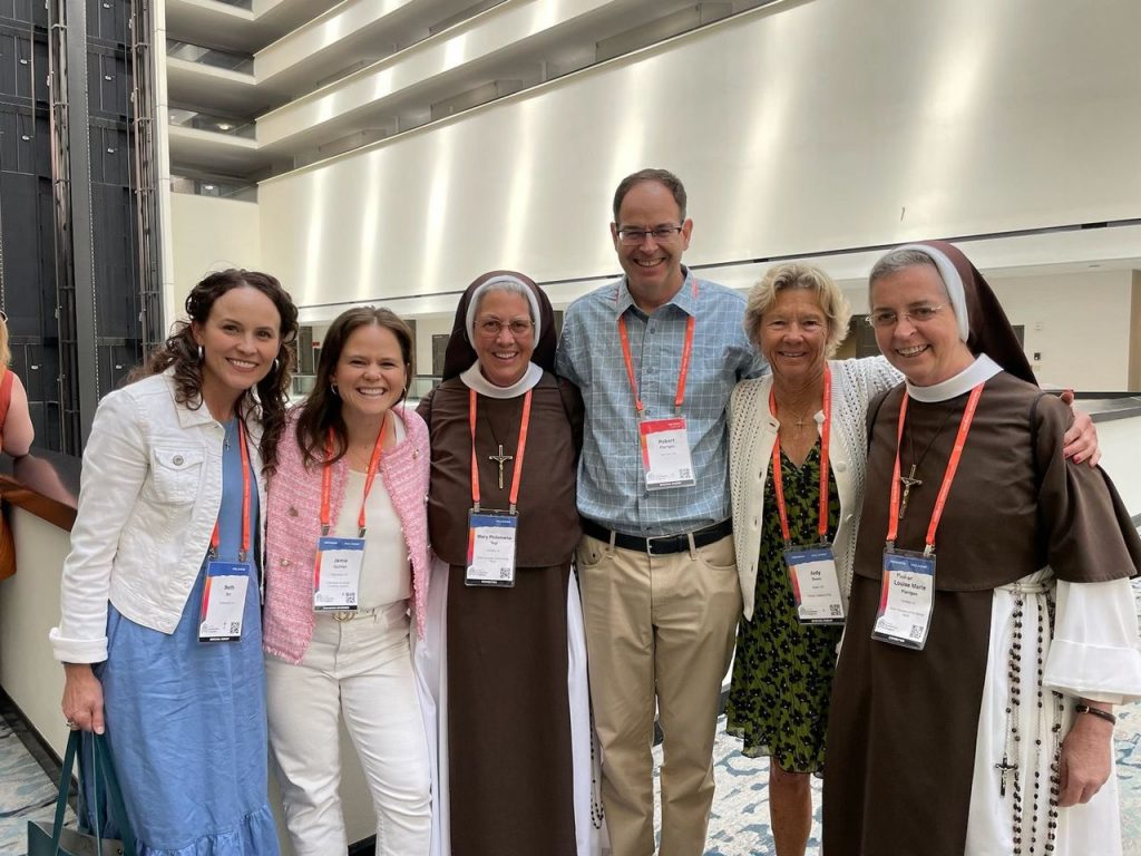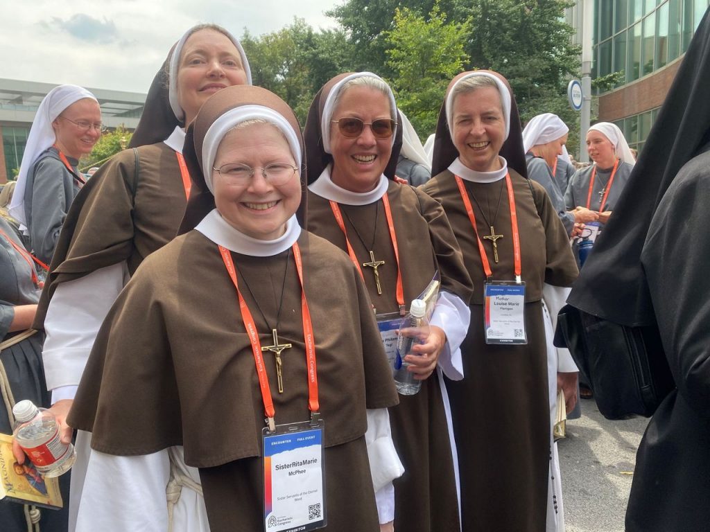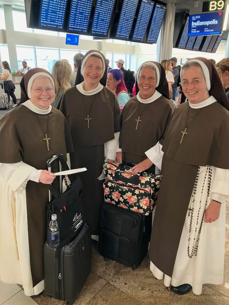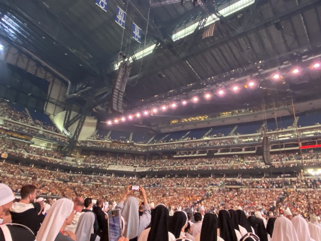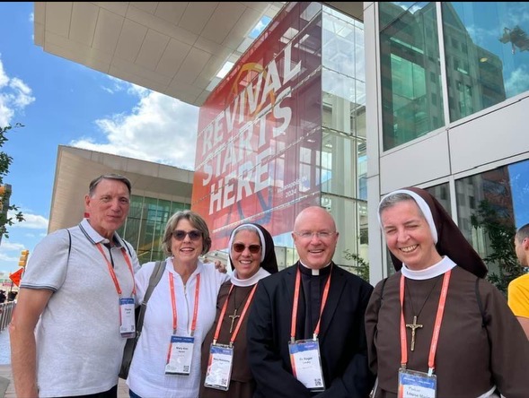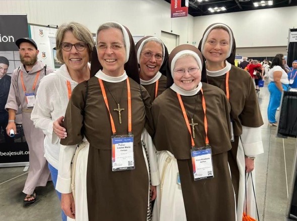 July 26, 2024 Reflections from Several Sisters Attending the Eucharistic Congress The National Eucharistic Congress was a wonderful opportunity to experience the mutual unity and support of the members of the Body of Christ, the Church. Seeing so many religious Sisters, priests, bishops and laity, was deeply affirming to each of us in our particular vocation. I personally met so many old friends – and made new and surprising ones – that what stands out to me is the community of believers gathered around Jesus. I know that I owe my faith to so many who have walked with me in my pilgrimage of faith over the years. And I am excited to “hoe my row” and work in His Vineyard with His coworkers until our glorious entry into His kingdom – Maranatha, Come Lord Jesus, Come! -Mother Louise Marie Mother Louise Marie with Stephanie and Dan BurkeSister Rita Marie with Adrienne, a cousin of Sister Mary AnthonyBishop Henning (Rhode Island) with his pilgrims and Tim, Mother Louise Marie’s brother (also R.I.)Mother Louise Marie and Sister Mary Philomena with Fr. Landry, a longtime retreat master at Casa Maria, and Mary Ann and Stephen JepsenFr. Joseph, MFVA and Fr. Patrick, MFVA with the Sisters after the procession BenedictionBeth Sri and other friends of FOCUS, and Bob, Mother Louise Marie’s (other) brotherFr. Jon Kalisch with the SistersMother Louise Marie and the Sisters with Mary Ann Jepsen (sister of Bishop Emeritus Robert Baker) and longtime friend Jesus said, “…and I when I am lifted up from the earth, I will draw all men to myself.” The Eucharistic Congress in Indianapolis celebrated the presence of Sacrifice of Christ on the altar at Mass, with opportunities to receive the fruit of this sacrifice: Communion with Our Lord, the source of holiness and food for the journey to heaven. There was time for acts of thanksgiving by adoring His Real Presence and receiving his blessing. Then the final commendation was to give back what we had been given, to our local Churches, our homes, and within our hearts. -Sister Rita Marie Pictured above: Evening Adoration; Public Procession with Benediction at the Civic Monument; Perpetual Adoration at the Church of St. John that was filled each day with prayer; the stadium held 60,000 souls worshipping together. Property of The Catholic ThingProperty of National Catholic RegisterProperty of National Catholic RegisterProperty of National Catholic Register My initial reaction coming home from the Congress is to say, “Wow! What an amazingly wonderful experience!” When I was growing up, the unwritten idea was that it is okay to be a strong Catholic, but just don’t share it with anyone. At World Youth Day in 1993, St. John Paul II said, “This is no time to be ashamed of the Gospel. It is the time to preach it from the rooftops…” Many listened. With this amazing Christ-centered Eucharistic Congress, Cardinal Luis Tagle said we should have a conversion to the Eucharist and then Go, Share the Faith! -Sister Marie Francesca I was so happy to be able to attend the Eucharist Congress, and to witness the faith and unity of priests, Sisters, and lay people. I was busy at our table, answering questions and sharing materials about our community, as well as attending smaller get-togethers. This experience of the Congress really uplifted me and strengthened my faith! -Sister Mary Philomena