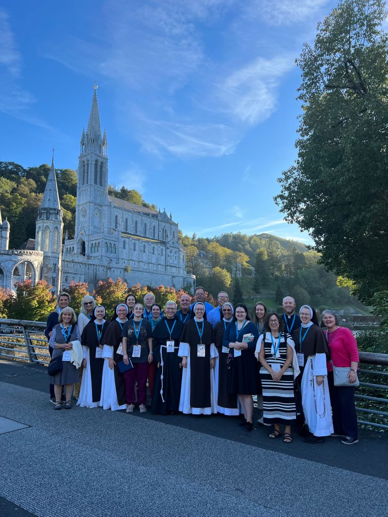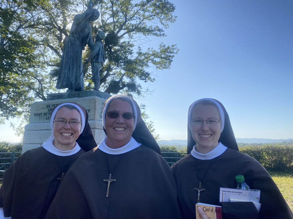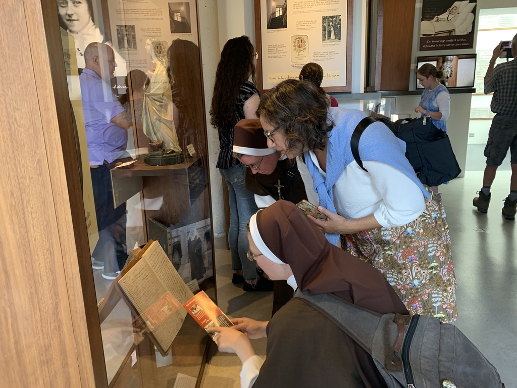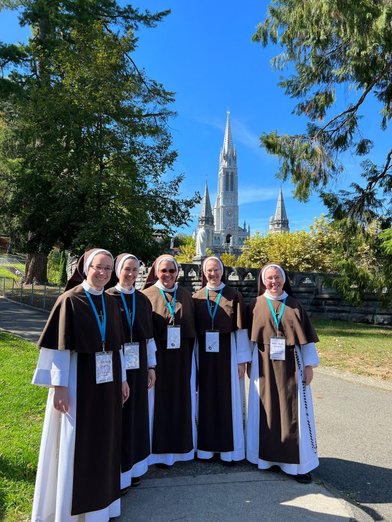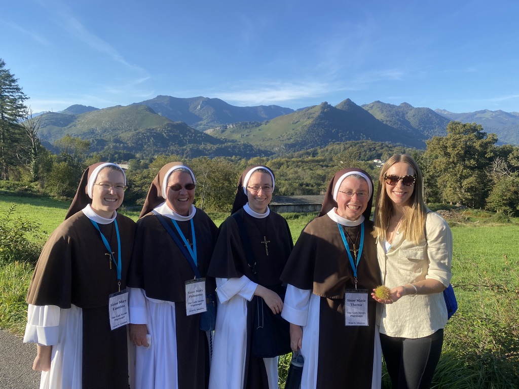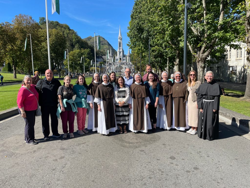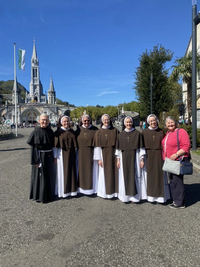 October 24, 2023 In Lisieux For Therese’s Feast Day Outside the Basilica of St. Therese By Sister Marie Therese At the end of September four other sisters and I headed to France for a pilgrimage. We spent six beautiful days in Lourdes which was followed by visits to Paris, Lisieux, Ars, and Nevers. The entire experience was amazing. In fact, when reflecting on the pilgrimage, it is hard to pin-point one instance or aspect that was the “best part.” A definite highlight, however, was our visit to Lisieux. On the Feast of St. Thérèse, October 1st , we were able to attend Mass at the Basilica of St. Thérèse and visit the Carmel where she was a nun. I wish that I had the memory and the space to write about every aspect of our visit, but I must be content with a few glimpses. I hope these glimpses will convey something of how grace-filled the experience was. The Mosaics of the Basilica are carefully crafted to represent Therese’s spiritualityPraying with Therese’s relicTherese’s relics were carried to the altar in the entrance procession of the Mass After Mass, pilgrims could bring roses to place upon Therese’s relicsThe relics of Therese’s parents, Louis and Zelie, are in the crypt underneath the Basilica The first impression of the Basilica was the size. It is definitely impressive and can accommodate 4,000 people. Another noticeable characteristic is a large mosaic depicting Jesus with Mary and St. Thérèse on either side. Mary and Thérèse are holding Jesus’ mantle open and ushering sheep under its folds. These two aspects, the size and the mosaic, speak volumes of St. Thérèse’s mission of “spending heaven doing good upon earth.’’ The size demonstrates that Thérèse’s mission is for the multitudes. Anyone who comes to her will find help. Also, as shown in the mosaic, she unites herself to the Blessed Mother so as to bring souls to Jesus. As souls grow in devotion to St. Thérèse, she, paradoxically, often slips more into the background. This is what is illustrated in the Basilica: she brings us under the mantle of Jesus where we don’t look at St. Thérèse, but we look at Jesus. She simply holds us there with her prayers and the miracles of grace for which she intercedes. Praying in front of her relics and being there with my dear friend (and yes, her presence was real and palpable) brought this realization to a deeper understanding. At the end of Mass, as another reminder of Thérèse’s mission and her promise of “showering down roses,” rose petals were scattered from the dome above us. St. Thérèse is still fulfilling her mission and keeping her promises. Ultimately, this is simply a reminder that Our Lord’s mission is also being fulfilled in us and that He is faithful to His promises. He is the giver of all good gifts and I am so grateful for the abundance of graces He gave during the pilgrimage. The Carmel of Lisieux has a lovely museum, displaying many items used by ThereseTherese’s profession cross, crown of roses, and samples of her writingsSome art supplies used by ThereseA portrait hung at Therese’s actual height – just like Sister Marie Therese!The outside of the Carmel chapelThe wax figure of Therese in the Carmel, where her reliquary is housed when not traveling (with the original statue of Our Lady of the Smile, in the alcove above)The plaque indicating the burial place of Therese’s three sisters who also died in this Carmel Below are some pictures from our time in Lourdes: The Sisters on pilgrimage, with our chaplain, Fr. James, and our dear friend Frankie who guided us through FranceThe entire pilgrimage group togetherMass at the Grotto, with the Irish pilgrimsA hiking trip along the route Bernadette would have travelled as shepherdess in BartresThe evening candlelight processions are a core piece of a Lourdes pilgrimage! And a few from our travels to Ars (where John Vianney served as priest) and Nevers (where St. Bernadette lived as a Religious Sister) Praying before St. John Vianney’s incorrupt heart in ArsThe Cure’s love for the saints is very evident by his collection of prints covering his walls!The chapel in Ars, left very much as it was in the Cure’s dayStudying John Vianney’s vestmentsJohn Vianney’s confessional in the sacristy This statue marks ‘The Place of Encounter’, where John Vianney stopped some boys to ask for directions when first arriving in Ars The convent where St. Bernadette joined the Sisters of Charity of NeversPraying with St. BernadetteWalking the beautiful grounds of the convent, where she too would have walkedThe statue Bernadette loved best