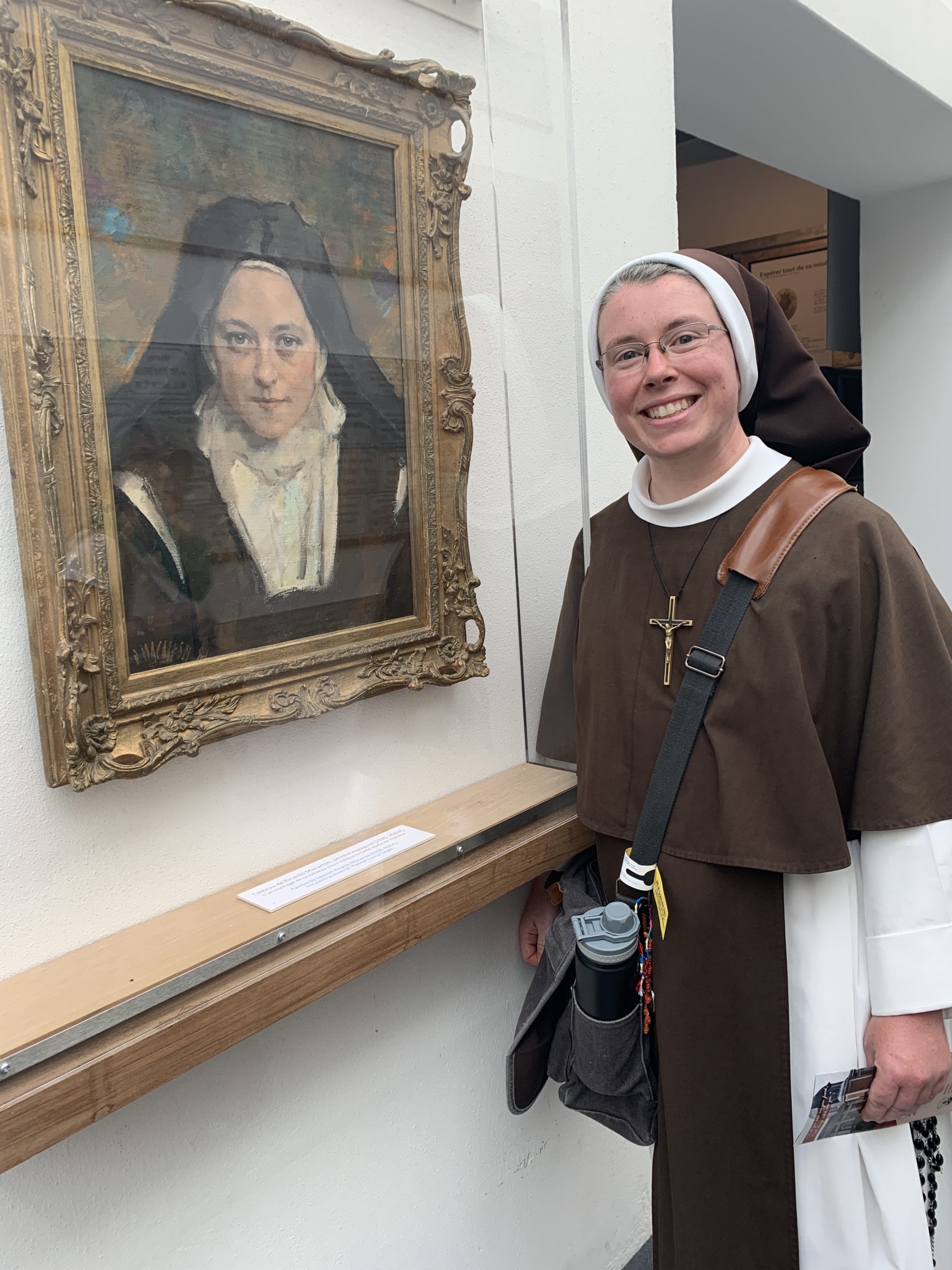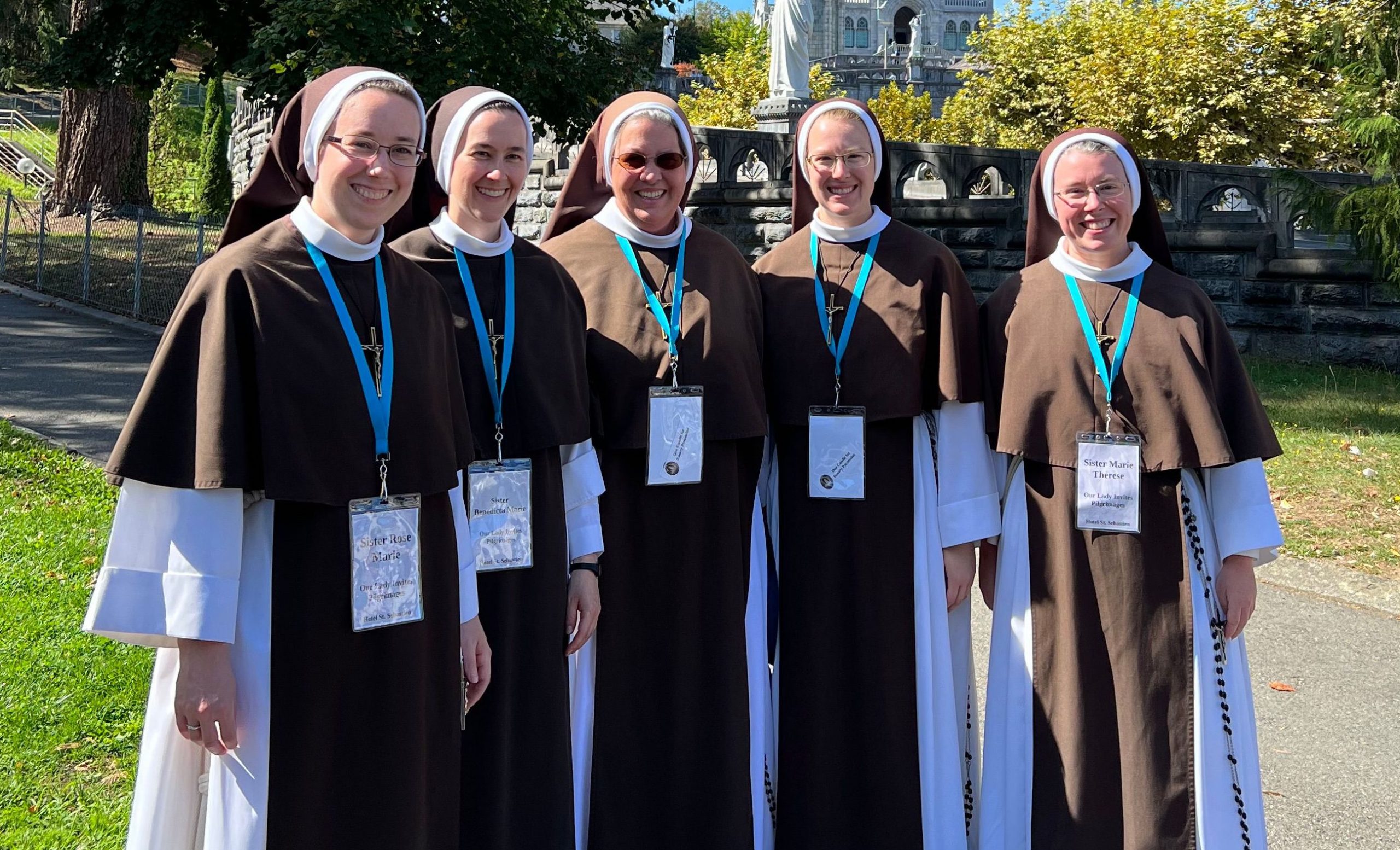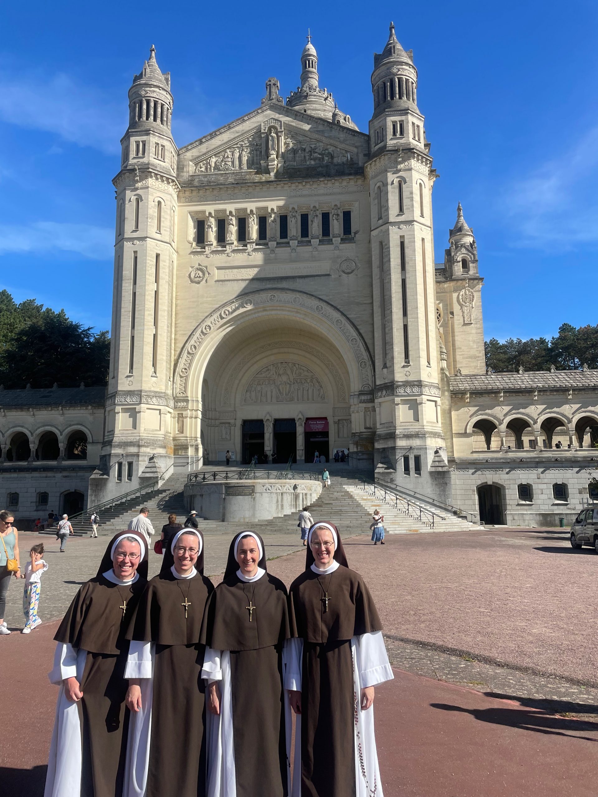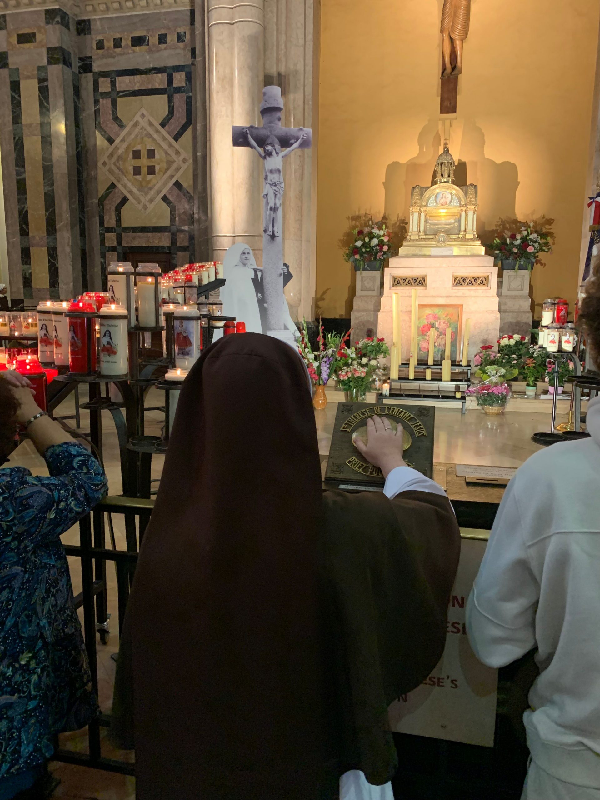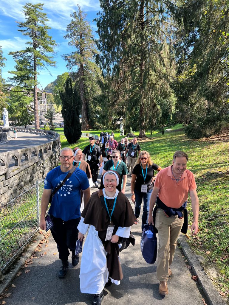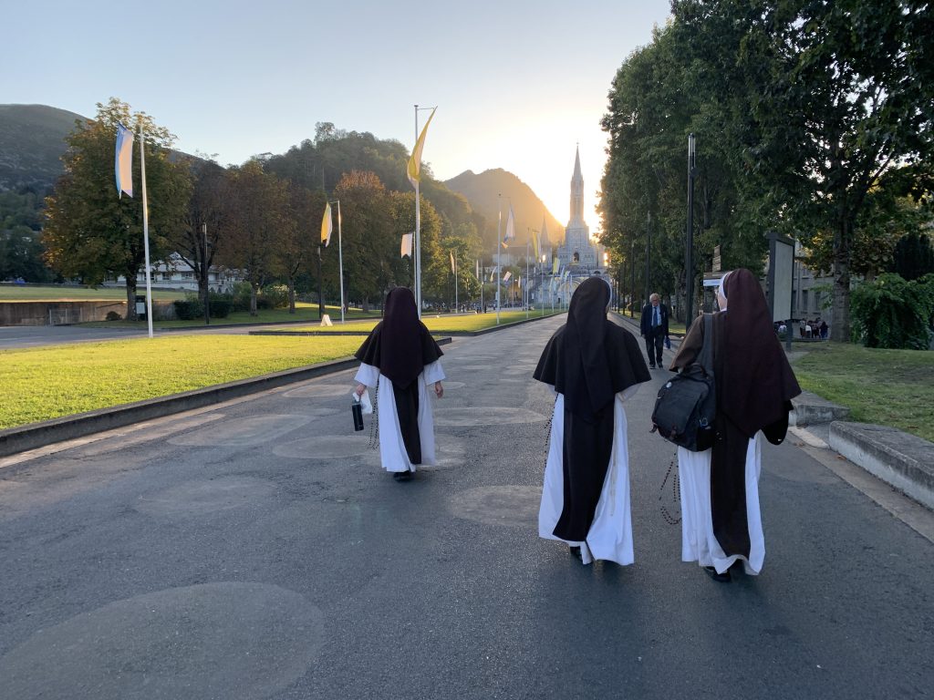 October 24, 2023 In Lisieux For Therese’s Feast Day Outside the Basilica of St. Therese By Sister Marie Therese At the end of September four other sisters and I headed to France for a pilgrimage. We spent six beautiful days in Lourdes which was followed by visits to Paris, Lisieux, Ars, and Nevers. The entire experience was amazing. In fact, when reflecting on the pilgrimage, it is hard to pin-point one instance or aspect that was the “best part.” A definite highlight, however, was our visit to Lisieux. On the Feast of St. Thérèse, October 1st , we were able to attend Mass at the Basilica of St. Thérèse and visit the Carmel where she was a nun. I wish that I had the memory and the space to write about every aspect of our visit, but I must be content with a few glimpses. I hope these glimpses will convey something of how grace-filled the experience was. The Mosaics of the Basilica are carefully crafted to represent Therese’s spiritualityPraying with Therese’s relicTherese’s relics were carried to the altar in the entrance procession of the Mass After Mass, pilgrims could bring roses to place upon Therese’s relicsThe relics of Therese’s parents, Louis and Zelie, are in the crypt underneath the Basilica The first impression of the Basilica was the size. It is definitely impressive and can accommodate 4,000 people. Another noticeable characteristic is a large mosaic depicting Jesus with Mary and St. Thérèse on either side. Mary and Thérèse are holding Jesus’ mantle open and ushering sheep under its folds. These two aspects, the size and the mosaic, speak volumes of St. Thérèse’s mission of “spending heaven doing good upon earth.’’ The size demonstrates that Thérèse’s mission is for the multitudes. Anyone who comes to her will find help. Also, as shown in the mosaic, she unites herself to the Blessed Mother so as to bring souls to Jesus. As souls grow in devotion to St. Thérèse, she, paradoxically, often slips more into the background. This is what is illustrated in the Basilica: she brings us under the mantle of Jesus where we don’t look at St. Thérèse, but we look at Jesus. She simply holds us there with her prayers and the miracles of grace for which she intercedes. Praying in front of her relics and being there with my dear friend (and yes, her presence was real and palpable) brought this realization to a deeper understanding. At the end of Mass, as another reminder of Thérèse’s mission and her promise of “showering down roses,” rose petals were scattered from the dome above us. St. Thérèse is still fulfilling her mission and keeping her promises. Ultimately, this is simply a reminder that Our Lord’s mission is also being fulfilled in us and that He is faithful to His promises. He is the giver of all good gifts and I am so grateful for the abundance of graces He gave during the pilgrimage. The Carmel of Lisieux has a lovely museum, displaying many items used by ThereseTherese’s profession cross, crown of roses, and samples of her writingsSome art supplies used by ThereseA portrait hung at Therese’s actual height – just like Sister Marie Therese!The outside of the Carmel chapelThe wax figure of Therese in the Carmel, where her reliquary is housed when not traveling (with the original statue of Our Lady of the Smile, in the alcove above)The plaque indicating the burial place of Therese’s three sisters who also died in this Carmel Below are some pictures from our time in Lourdes: The Sisters on pilgrimage, with our chaplain, Fr. James, and our dear friend Frankie who guided us through FranceThe entire pilgrimage group togetherMass at the Grotto, with the Irish pilgrimsA hiking trip along the route Bernadette would have travelled as shepherdess in BartresThe evening candlelight processions are a core piece of a Lourdes pilgrimage! And a few from our travels to Ars (where John Vianney served as priest) and Nevers (where St. Bernadette lived as a Religious Sister) Praying before St. John Vianney’s incorrupt heart in ArsThe Cure’s love for the saints is very evident by his collection of prints covering his walls!The chapel in Ars, left very much as it was in the Cure’s dayStudying John Vianney’s vestmentsJohn Vianney’s confessional in the sacristy This statue marks ‘The Place of Encounter’, where John Vianney stopped some boys to ask for directions when first arriving in Ars The convent where St. Bernadette joined the Sisters of Charity of NeversPraying with St. BernadetteWalking the beautiful grounds of the convent, where she too would have walkedThe statue Bernadette loved best