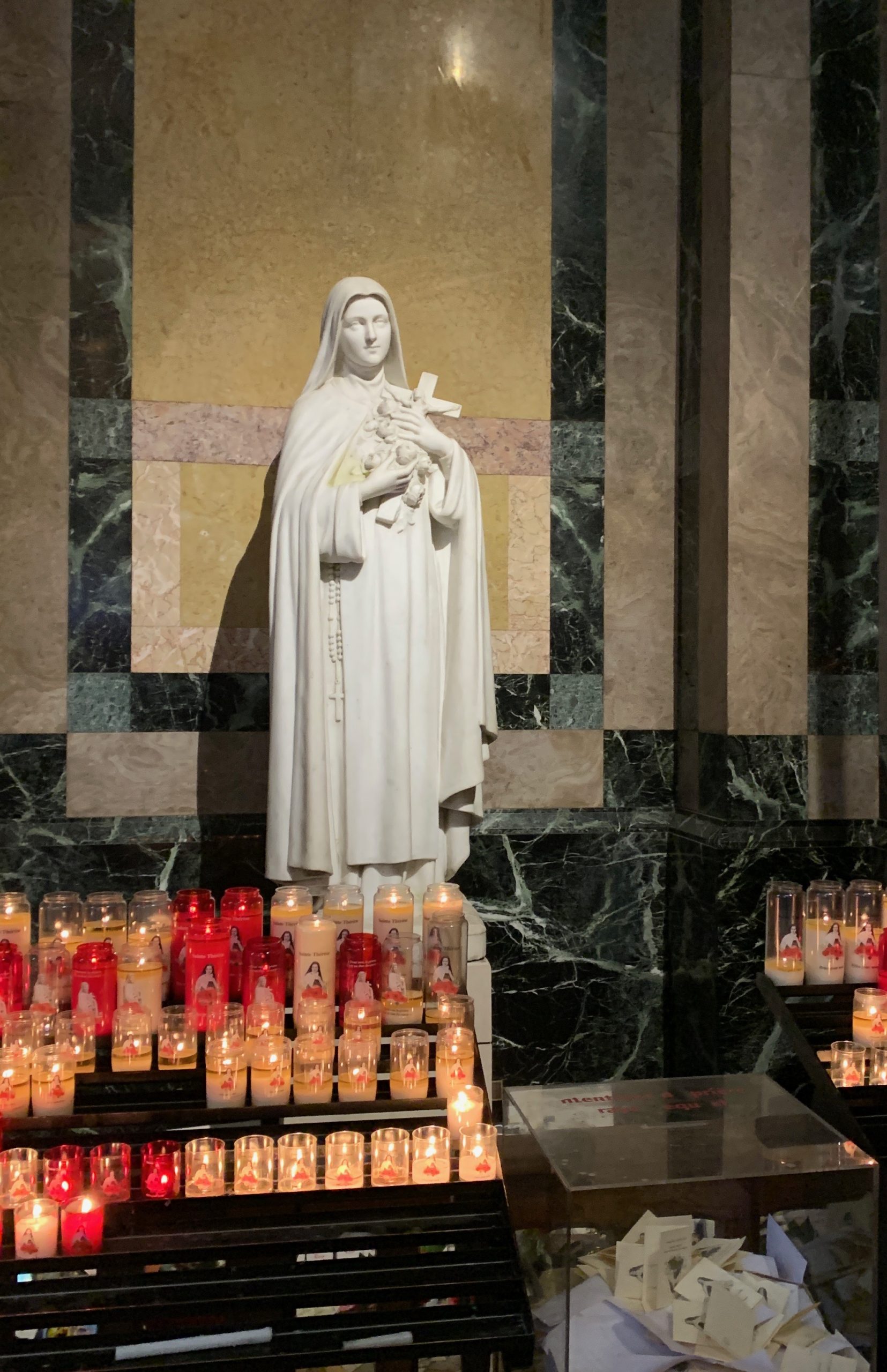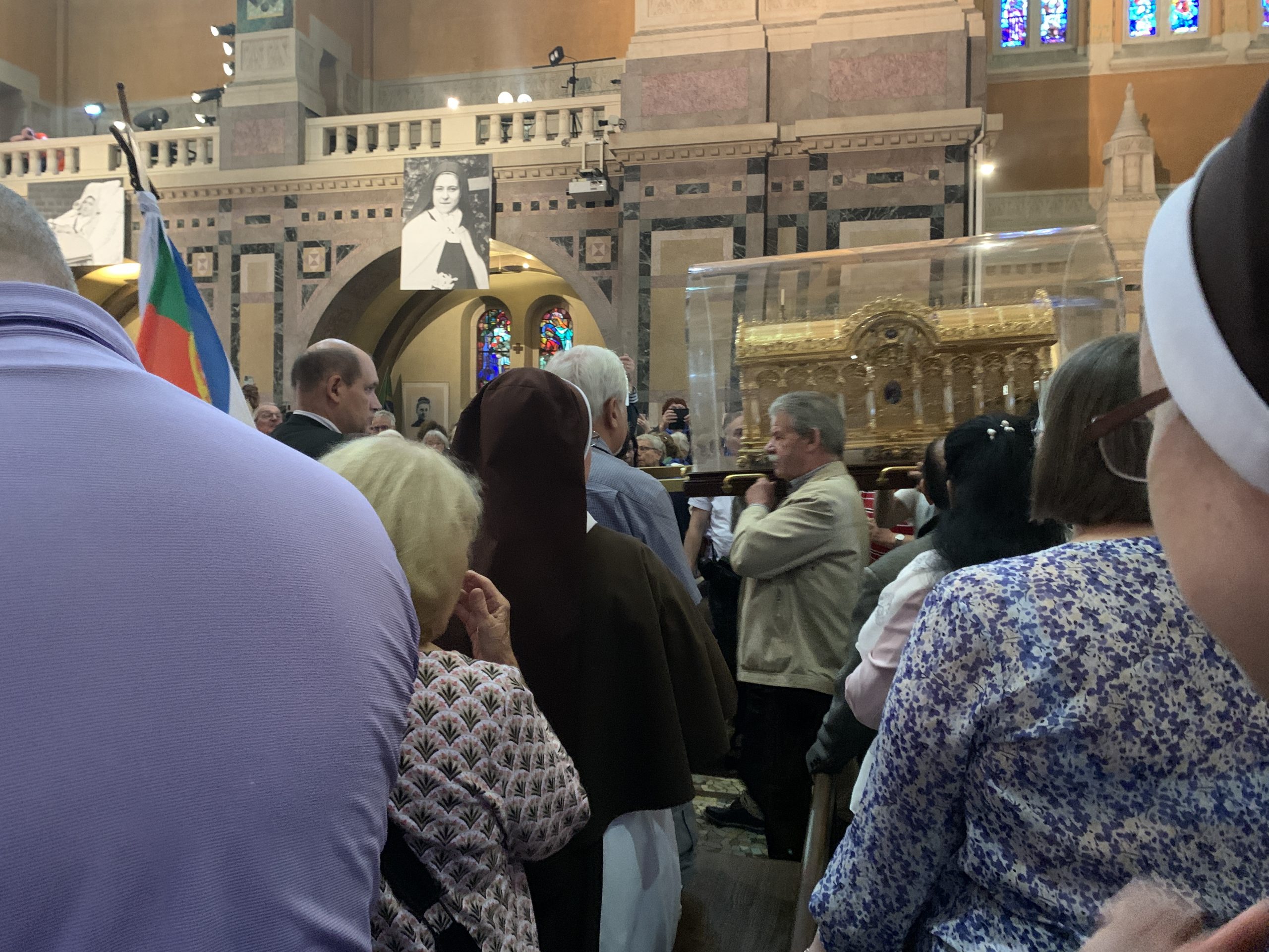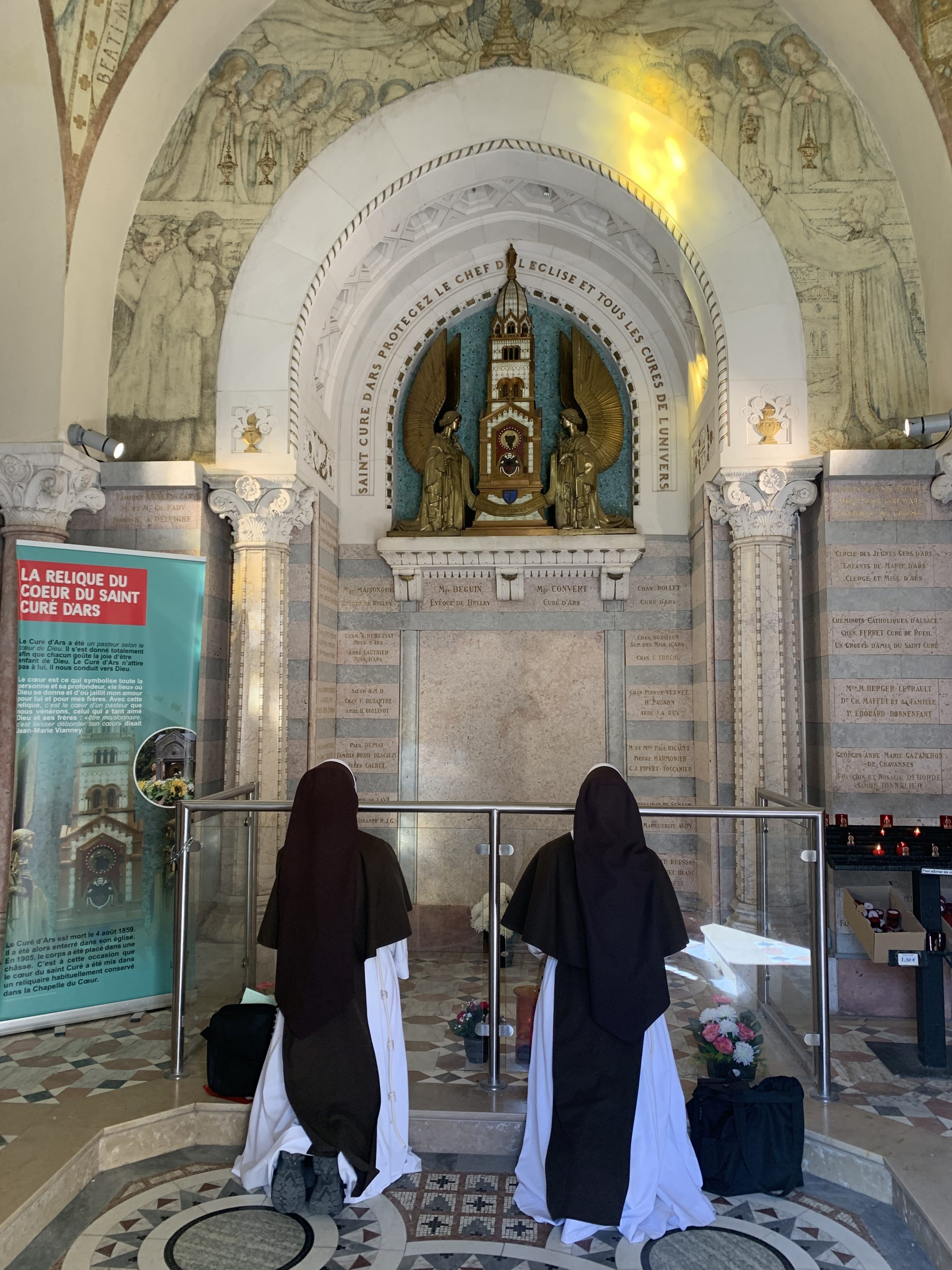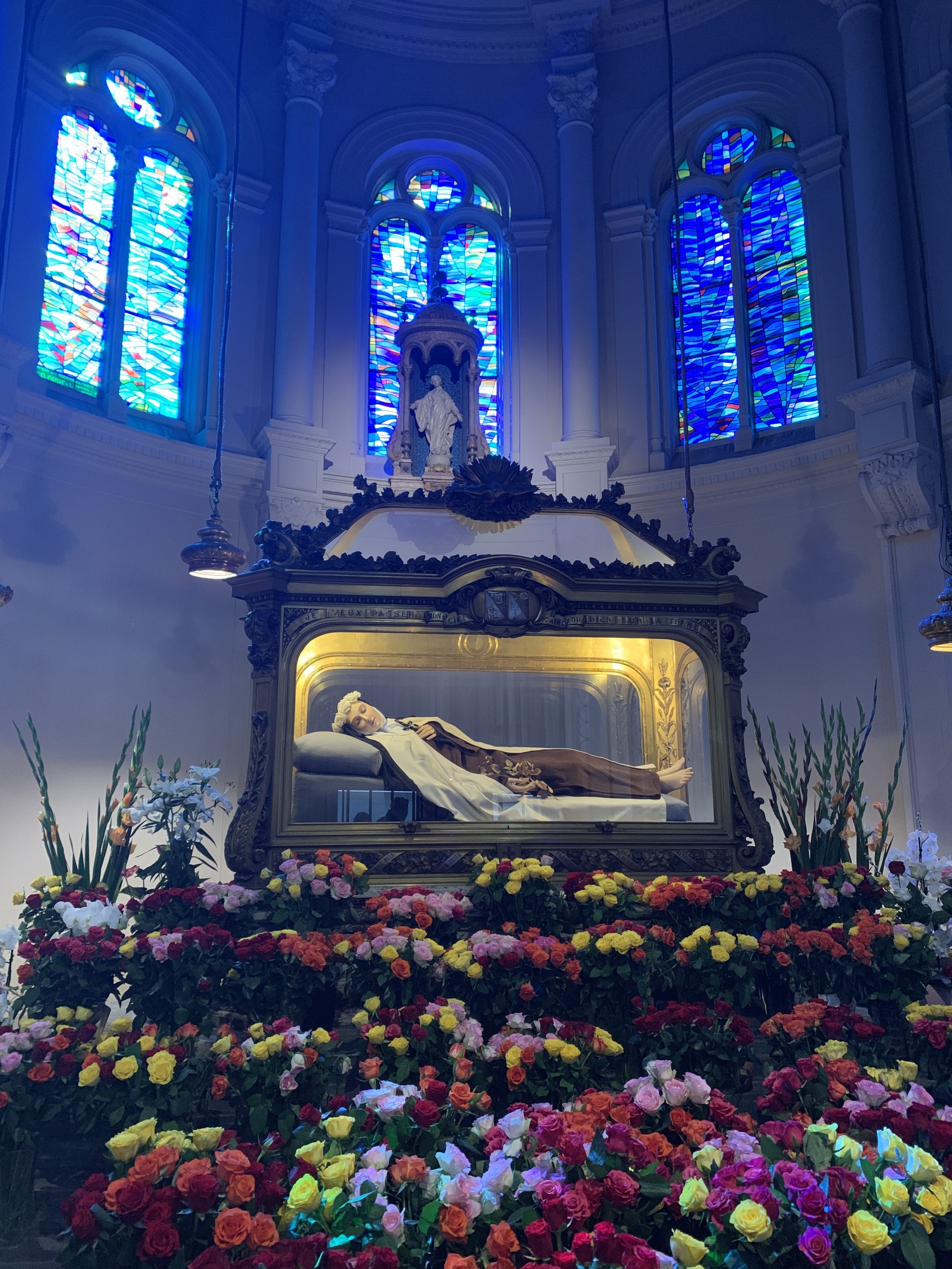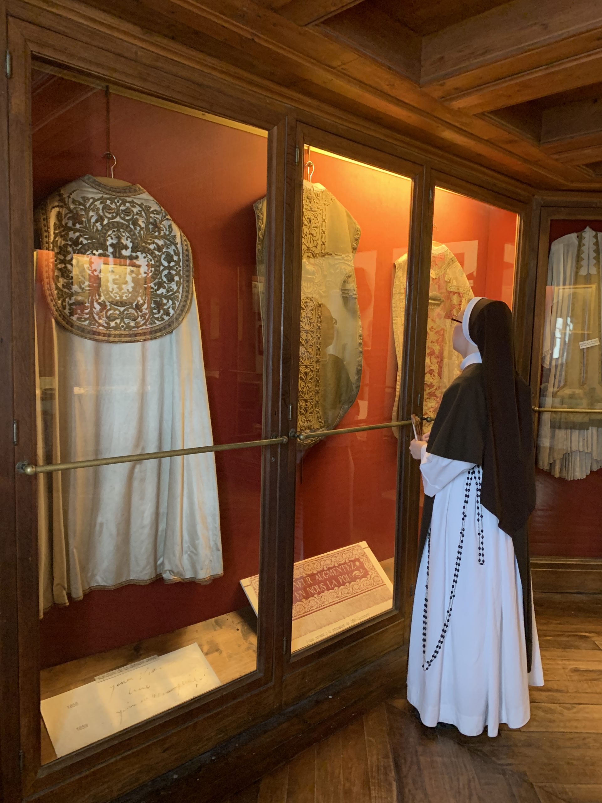 October 24, 2023 In Lisieux For Therese’s Feast Day Outside the Basilica of St. Therese By Sister Marie Therese At the end of September four other sisters and I headed to France for a pilgrimage. We spent six beautiful days in Lourdes which was followed by visits to Paris, Lisieux, Ars, and Nevers. The entire experience was amazing. In fact, when reflecting on the pilgrimage, it is hard to pin-point one instance or aspect that was the “best part.” A definite highlight, however, was our visit to Lisieux. On the Feast of St. Thérèse, October 1st , we were able to attend Mass at the Basilica of St. Thérèse and visit the Carmel where she was a nun. I wish that I had the memory and the space to write about every aspect of our visit, but I must be content with a few glimpses. I hope these glimpses will convey something of how grace-filled the experience was. The Mosaics of the Basilica are carefully crafted to represent Therese’s spiritualityPraying with Therese’s relicTherese’s relics were carried to the altar in the entrance procession of the Mass After Mass, pilgrims could bring roses to place upon Therese’s relicsThe relics of Therese’s parents, Louis and Zelie, are in the crypt underneath the Basilica The first impression of the Basilica was the size. It is definitely impressive and can accommodate 4,000 people. Another noticeable characteristic is a large mosaic depicting Jesus with Mary and St. Thérèse on either side. Mary and Thérèse are holding Jesus’ mantle open and ushering sheep under its folds. These two aspects, the size and the mosaic, speak volumes of St. Thérèse’s mission of “spending heaven doing good upon earth.’’ The size demonstrates that Thérèse’s mission is for the multitudes. Anyone who comes to her will find help. Also, as shown in the mosaic, she unites herself to the Blessed Mother so as to bring souls to Jesus. As souls grow in devotion to St. Thérèse, she, paradoxically, often slips more into the background. This is what is illustrated in the Basilica: she brings us under the mantle of Jesus where we don’t look at St. Thérèse, but we look at Jesus. She simply holds us there with her prayers and the miracles of grace for which she intercedes. Praying in front of her relics and being there with my dear friend (and yes, her presence was real and palpable) brought this realization to a deeper understanding. At the end of Mass, as another reminder of Thérèse’s mission and her promise of “showering down roses,” rose petals were scattered from the dome above us. St. Thérèse is still fulfilling her mission and keeping her promises. Ultimately, this is simply a reminder that Our Lord’s mission is also being fulfilled in us and that He is faithful to His promises. He is the giver of all good gifts and I am so grateful for the abundance of graces He gave during the pilgrimage. The Carmel of Lisieux has a lovely museum, displaying many items used by ThereseTherese’s profession cross, crown of roses, and samples of her writingsSome art supplies used by ThereseA portrait hung at Therese’s actual height – just like Sister Marie Therese!The outside of the Carmel chapelThe wax figure of Therese in the Carmel, where her reliquary is housed when not traveling (with the original statue of Our Lady of the Smile, in the alcove above)The plaque indicating the burial place of Therese’s three sisters who also died in this Carmel Below are some pictures from our time in Lourdes: The Sisters on pilgrimage, with our chaplain, Fr. James, and our dear friend Frankie who guided us through FranceThe entire pilgrimage group togetherMass at the Grotto, with the Irish pilgrimsA hiking trip along the route Bernadette would have travelled as shepherdess in BartresThe evening candlelight processions are a core piece of a Lourdes pilgrimage! And a few from our travels to Ars (where John Vianney served as priest) and Nevers (where St. Bernadette lived as a Religious Sister) Praying before St. John Vianney’s incorrupt heart in ArsThe Cure’s love for the saints is very evident by his collection of prints covering his walls!The chapel in Ars, left very much as it was in the Cure’s dayStudying John Vianney’s vestmentsJohn Vianney’s confessional in the sacristy This statue marks ‘The Place of Encounter’, where John Vianney stopped some boys to ask for directions when first arriving in Ars The convent where St. Bernadette joined the Sisters of Charity of NeversPraying with St. BernadetteWalking the beautiful grounds of the convent, where she too would have walkedThe statue Bernadette loved best