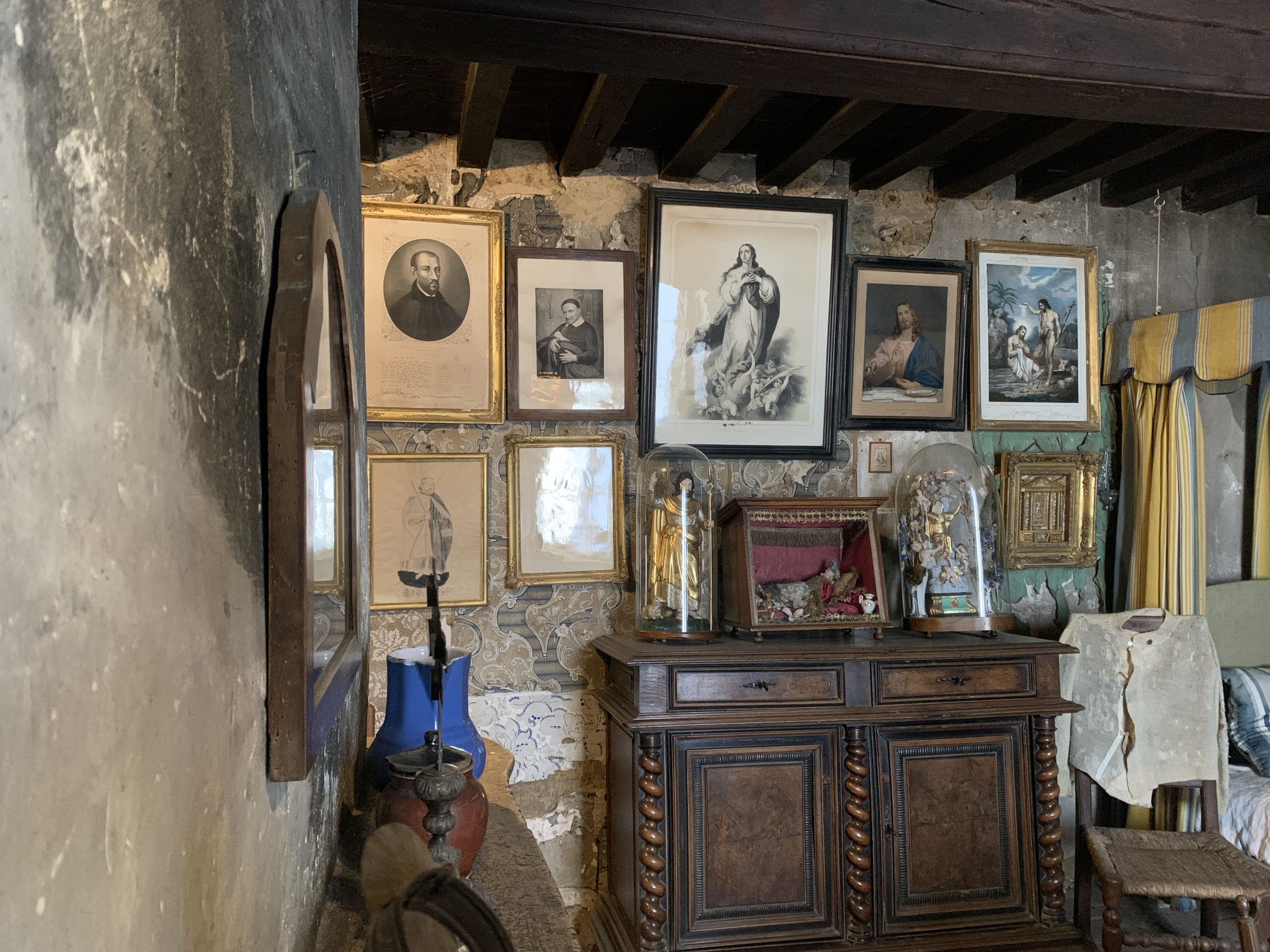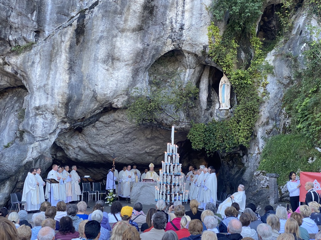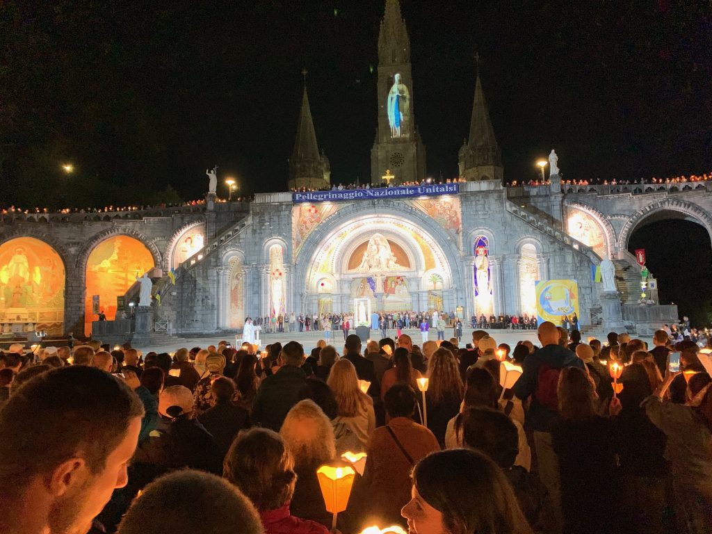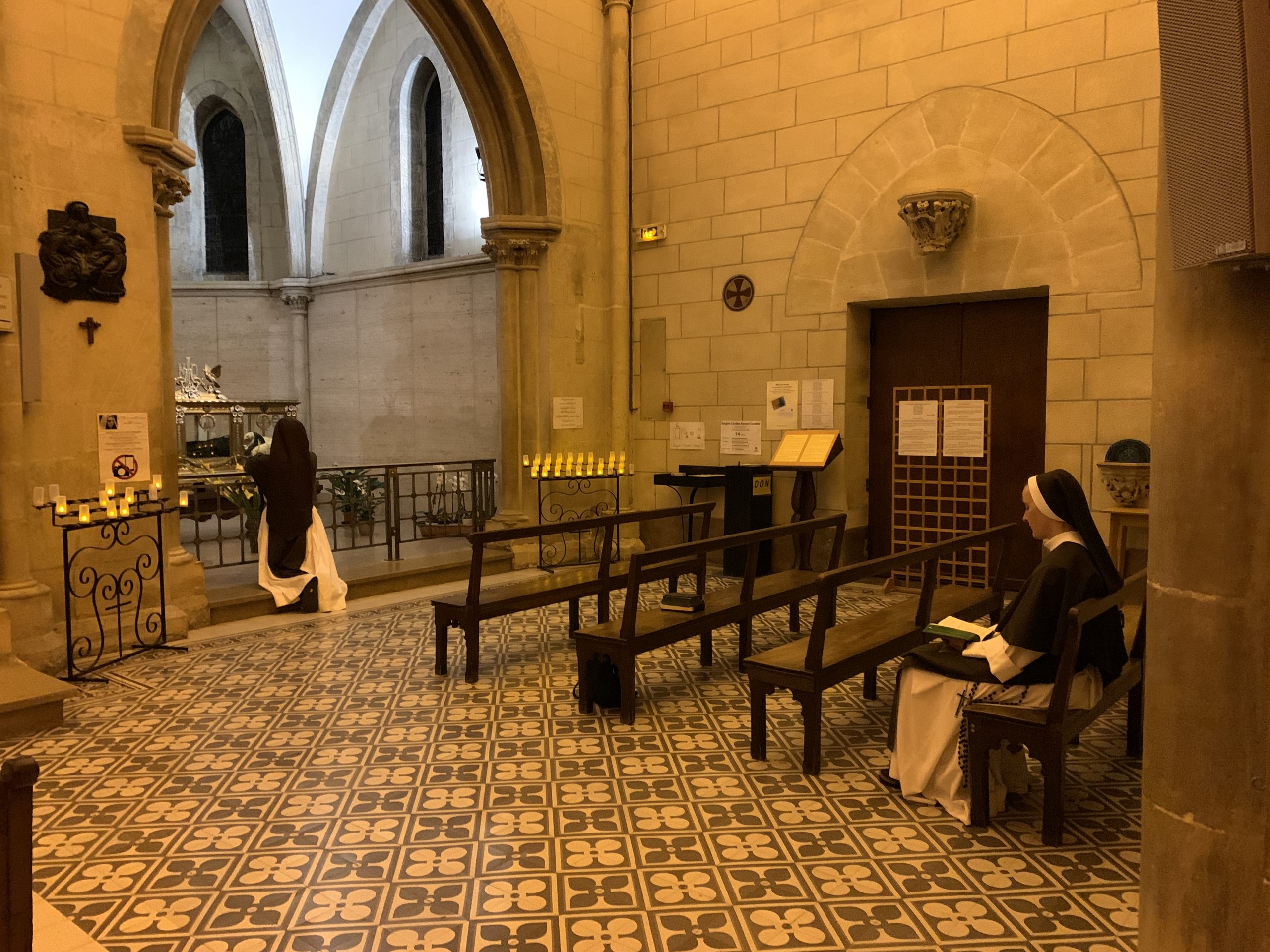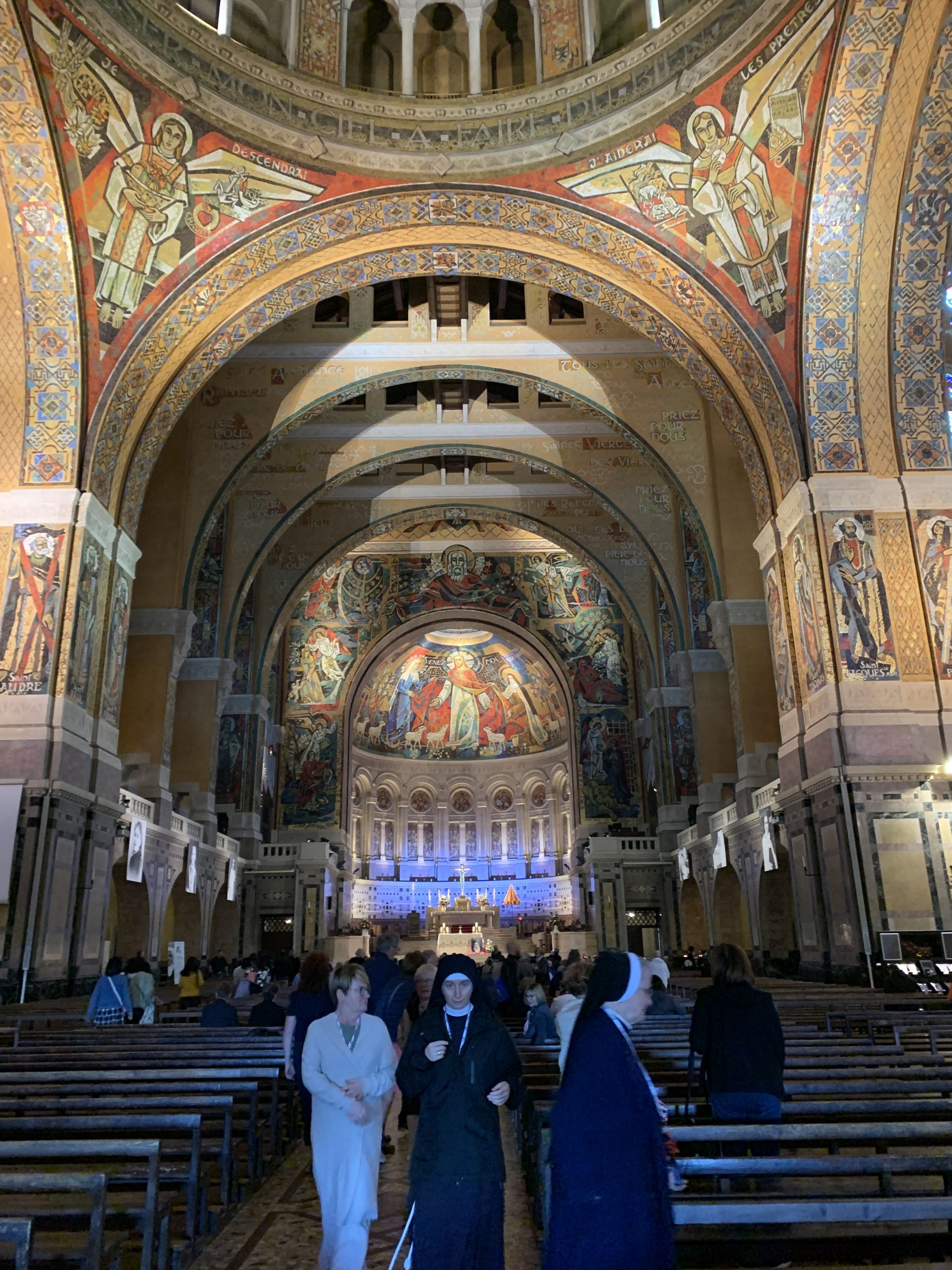 October 24, 2023 In Lisieux For Therese’s Feast Day Outside the Basilica of St. Therese By Sister Marie Therese At the end of September four other sisters and I headed to France for a pilgrimage. We spent six beautiful days in Lourdes which was followed by visits to Paris, Lisieux, Ars, and Nevers. The entire experience was amazing. In fact, when reflecting on the pilgrimage, it is hard to pin-point one instance or aspect that was the “best part.” A definite highlight, however, was our visit to Lisieux. On the Feast of St. Thérèse, October 1st , we were able to attend Mass at the Basilica of St. Thérèse and visit the Carmel where she was a nun. I wish that I had the memory and the space to write about every aspect of our visit, but I must be content with a few glimpses. I hope these glimpses will convey something of how grace-filled the experience was. The Mosaics of the Basilica are carefully crafted to represent Therese’s spiritualityPraying with Therese’s relicTherese’s relics were carried to the altar in the entrance procession of the Mass After Mass, pilgrims could bring roses to place upon Therese’s relicsThe relics of Therese’s parents, Louis and Zelie, are in the crypt underneath the Basilica The first impression of the Basilica was the size. It is definitely impressive and can accommodate 4,000 people. Another noticeable characteristic is a large mosaic depicting Jesus with Mary and St. Thérèse on either side. Mary and Thérèse are holding Jesus’ mantle open and ushering sheep under its folds. These two aspects, the size and the mosaic, speak volumes of St. Thérèse’s mission of “spending heaven doing good upon earth.’’ The size demonstrates that Thérèse’s mission is for the multitudes. Anyone who comes to her will find help. Also, as shown in the mosaic, she unites herself to the Blessed Mother so as to bring souls to Jesus. As souls grow in devotion to St. Thérèse, she, paradoxically, often slips more into the background. This is what is illustrated in the Basilica: she brings us under the mantle of Jesus where we don’t look at St. Thérèse, but we look at Jesus. She simply holds us there with her prayers and the miracles of grace for which she intercedes. Praying in front of her relics and being there with my dear friend (and yes, her presence was real and palpable) brought this realization to a deeper understanding. At the end of Mass, as another reminder of Thérèse’s mission and her promise of “showering down roses,” rose petals were scattered from the dome above us. St. Thérèse is still fulfilling her mission and keeping her promises. Ultimately, this is simply a reminder that Our Lord’s mission is also being fulfilled in us and that He is faithful to His promises. He is the giver of all good gifts and I am so grateful for the abundance of graces He gave during the pilgrimage. The Carmel of Lisieux has a lovely museum, displaying many items used by ThereseTherese’s profession cross, crown of roses, and samples of her writingsSome art supplies used by ThereseA portrait hung at Therese’s actual height – just like Sister Marie Therese!The outside of the Carmel chapelThe wax figure of Therese in the Carmel, where her reliquary is housed when not traveling (with the original statue of Our Lady of the Smile, in the alcove above)The plaque indicating the burial place of Therese’s three sisters who also died in this Carmel Below are some pictures from our time in Lourdes: The Sisters on pilgrimage, with our chaplain, Fr. James, and our dear friend Frankie who guided us through FranceThe entire pilgrimage group togetherMass at the Grotto, with the Irish pilgrimsA hiking trip along the route Bernadette would have travelled as shepherdess in BartresThe evening candlelight processions are a core piece of a Lourdes pilgrimage! And a few from our travels to Ars (where John Vianney served as priest) and Nevers (where St. Bernadette lived as a Religious Sister) Praying before St. John Vianney’s incorrupt heart in ArsThe Cure’s love for the saints is very evident by his collection of prints covering his walls!The chapel in Ars, left very much as it was in the Cure’s dayStudying John Vianney’s vestmentsJohn Vianney’s confessional in the sacristy This statue marks ‘The Place of Encounter’, where John Vianney stopped some boys to ask for directions when first arriving in Ars The convent where St. Bernadette joined the Sisters of Charity of NeversPraying with St. BernadetteWalking the beautiful grounds of the convent, where she too would have walkedThe statue Bernadette loved best