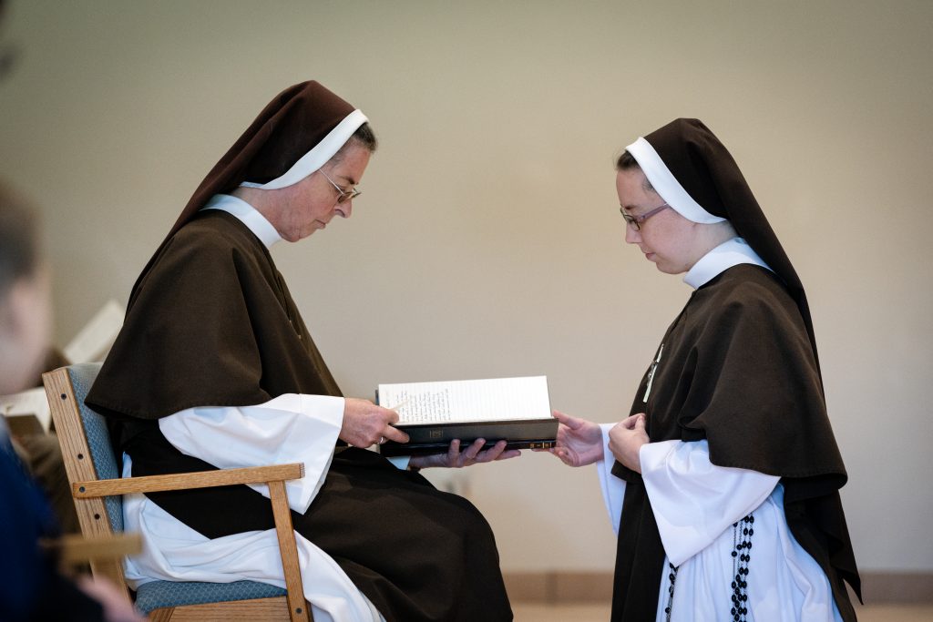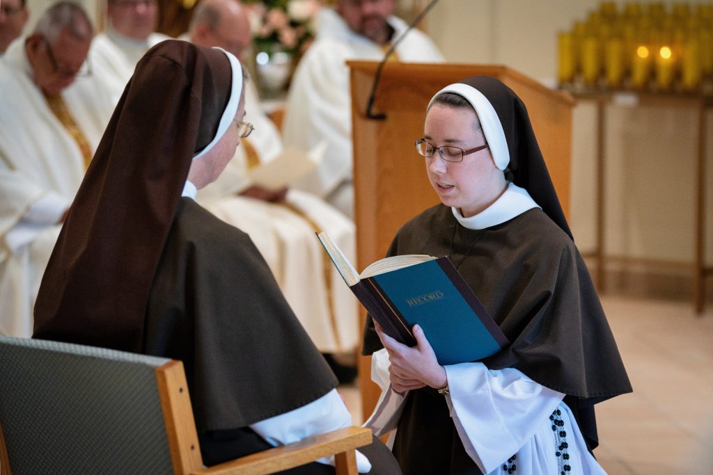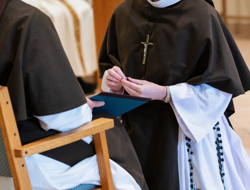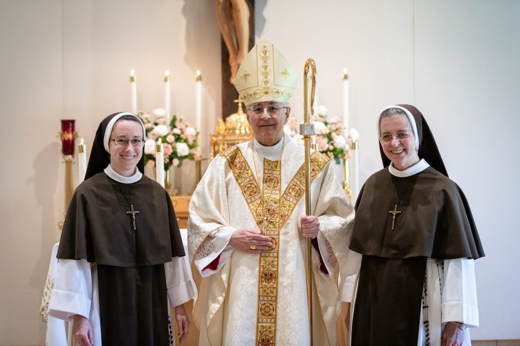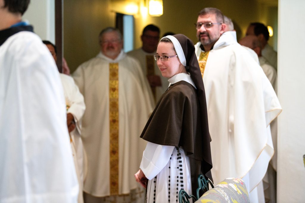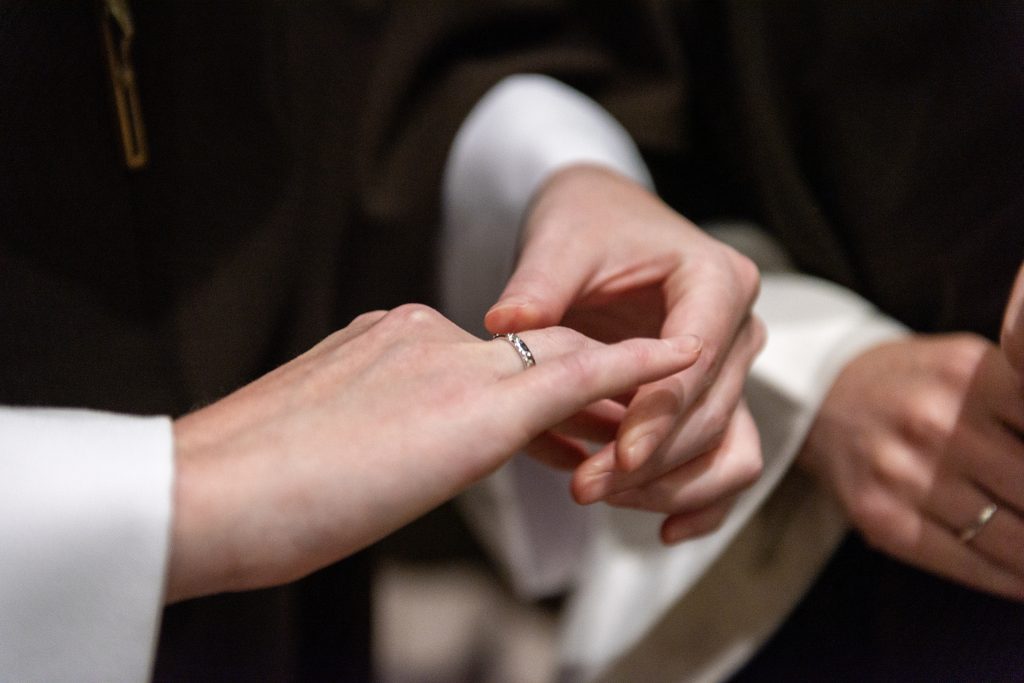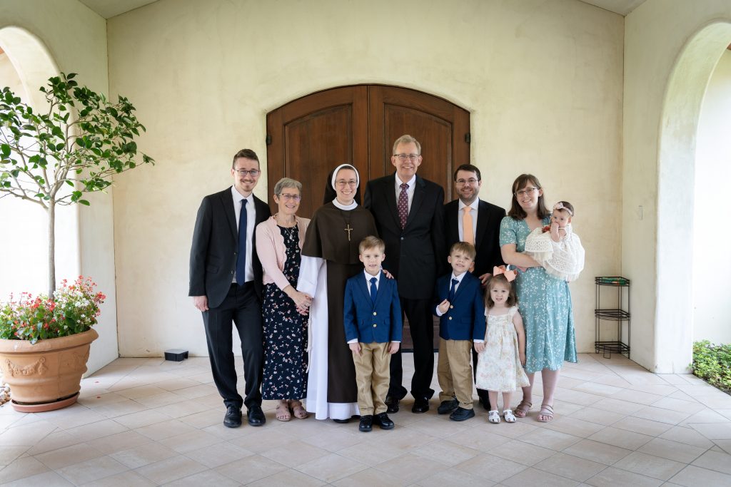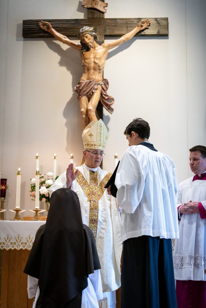 August 31, 2023 Sister Rose Marie’s Final Profession (see full album of pictures here) “Although you have not seen Him, you love Him; and even though you do not see Him now, you believe in Him and rejoice with an indescribable and glorious joy” – 1 Peter 1:8 Last Tuesday, the Feast of the Queenship of Mary, I was given the great blessing of making my Perpetual Profession of Vows. In the months leading up to this day, I was filled with ever greater gratitude for this gift! From my earliest days, God had set me apart to be His own. At last I was to give my total ‘yes’ to His plan! The day was filled with joy from beginning to end, with family and friends coming from near and far to celebrate with us. But the greatest expression of joy was in the Liturgy itself. As I stood waiting for the entrance procession to form, the butterflies began to increase, but stopped suddenly when the Sisters began to sing, “O veni, Sponsa Christi, veni” (O Come, spouse of Christ, come) I am His, and He is mine! And how beautiful that this gift of self is made within the framework of the Holy Mass. My thoughts were spinning as the Mass began. But then I looked up at the crucifix, the image of my Spouse Who sacrificed Himself for me. And from that moment on, my focus was fixed upon declaring my ‘yes’, to be united with Him in His sacrifice. What joy! Whatever God has planned for the rest of my life, one thing is certain. This is a supernatural road, and I will need a constant gift of grace to follow in a way pleasing to Him. Please continue to pray for me, and for all Religious, that we may faithfully accomplish His will in all things! (see full album of pictures here)