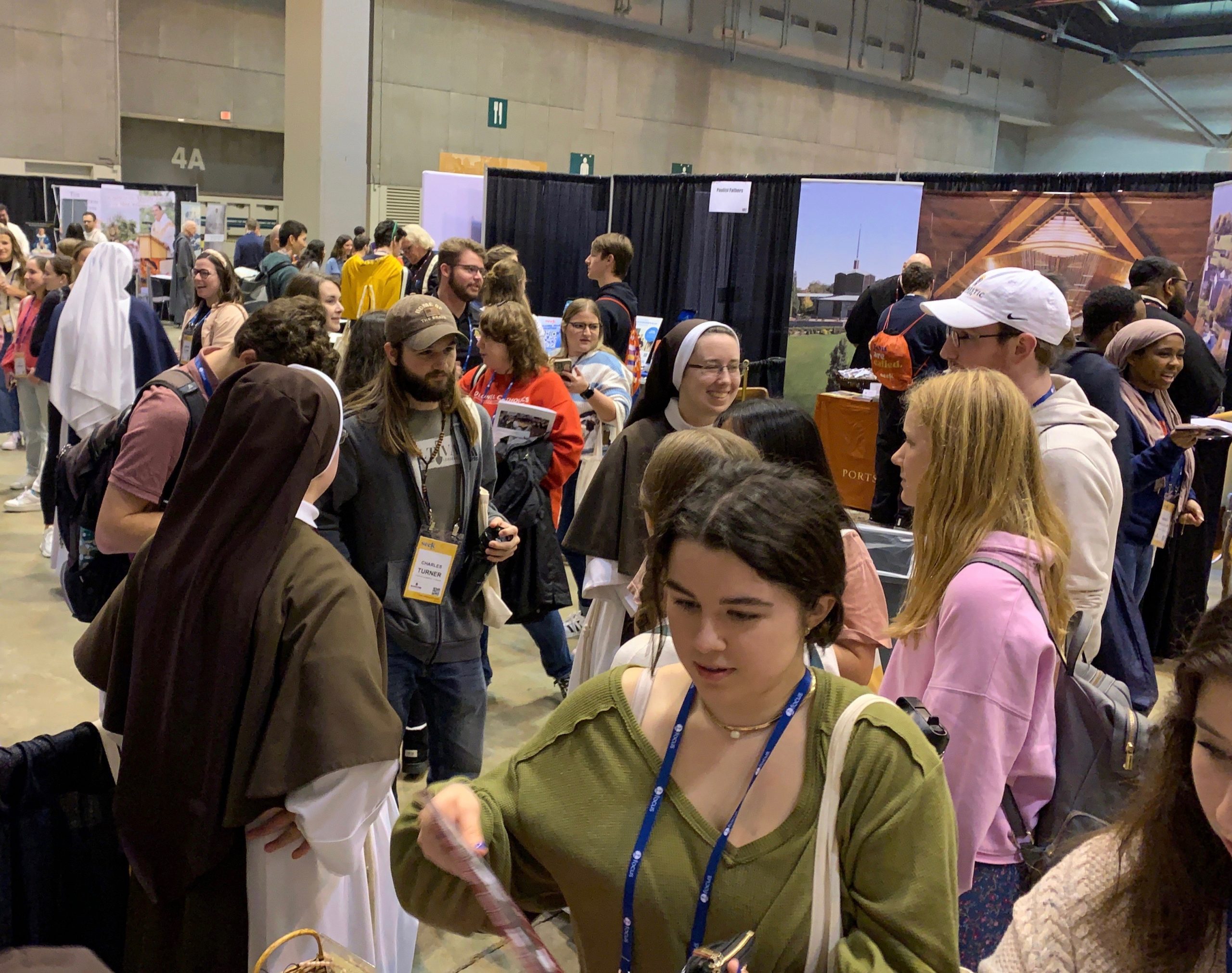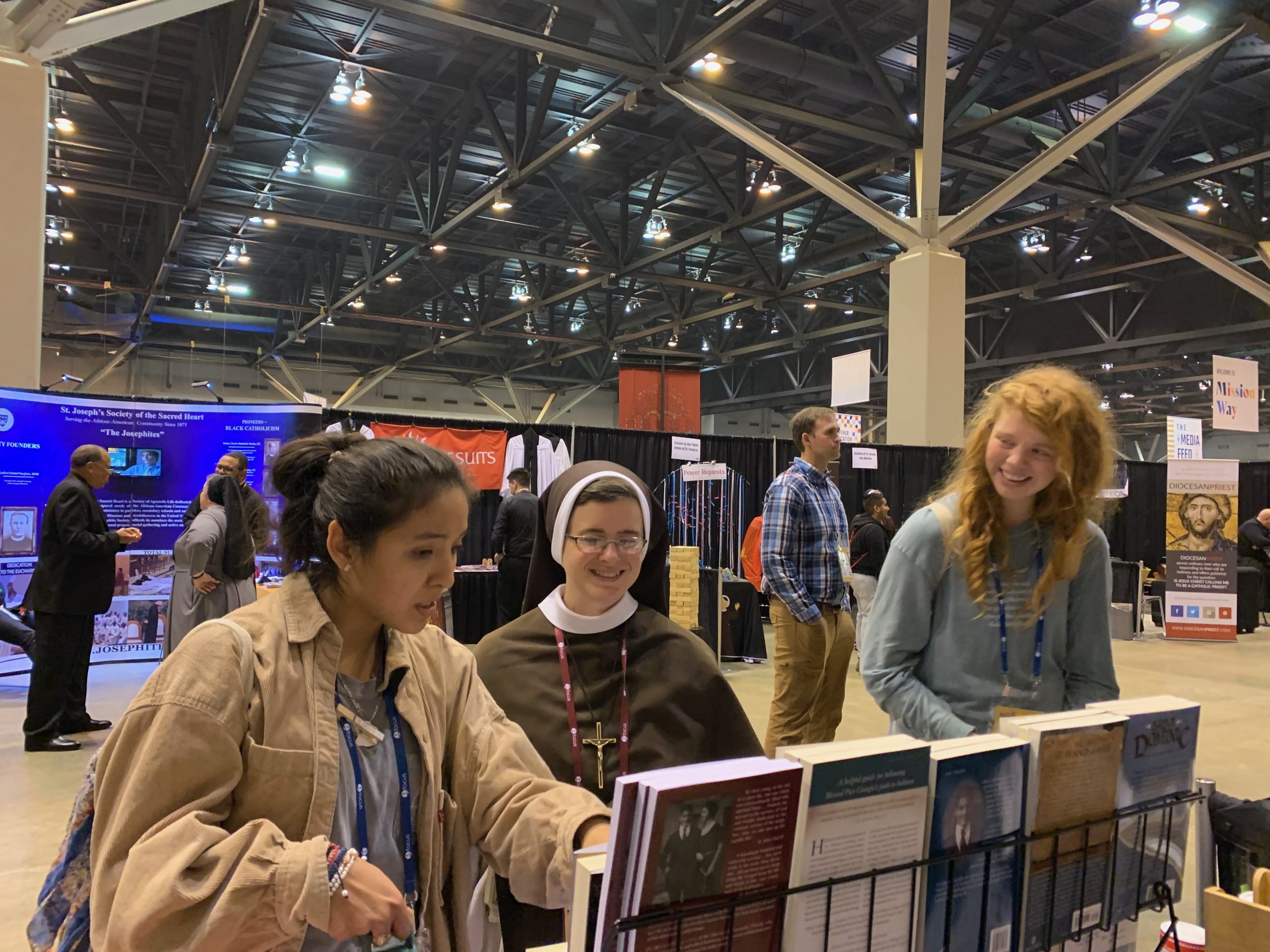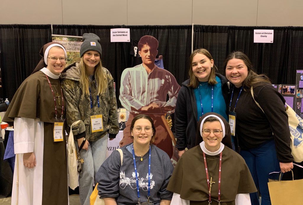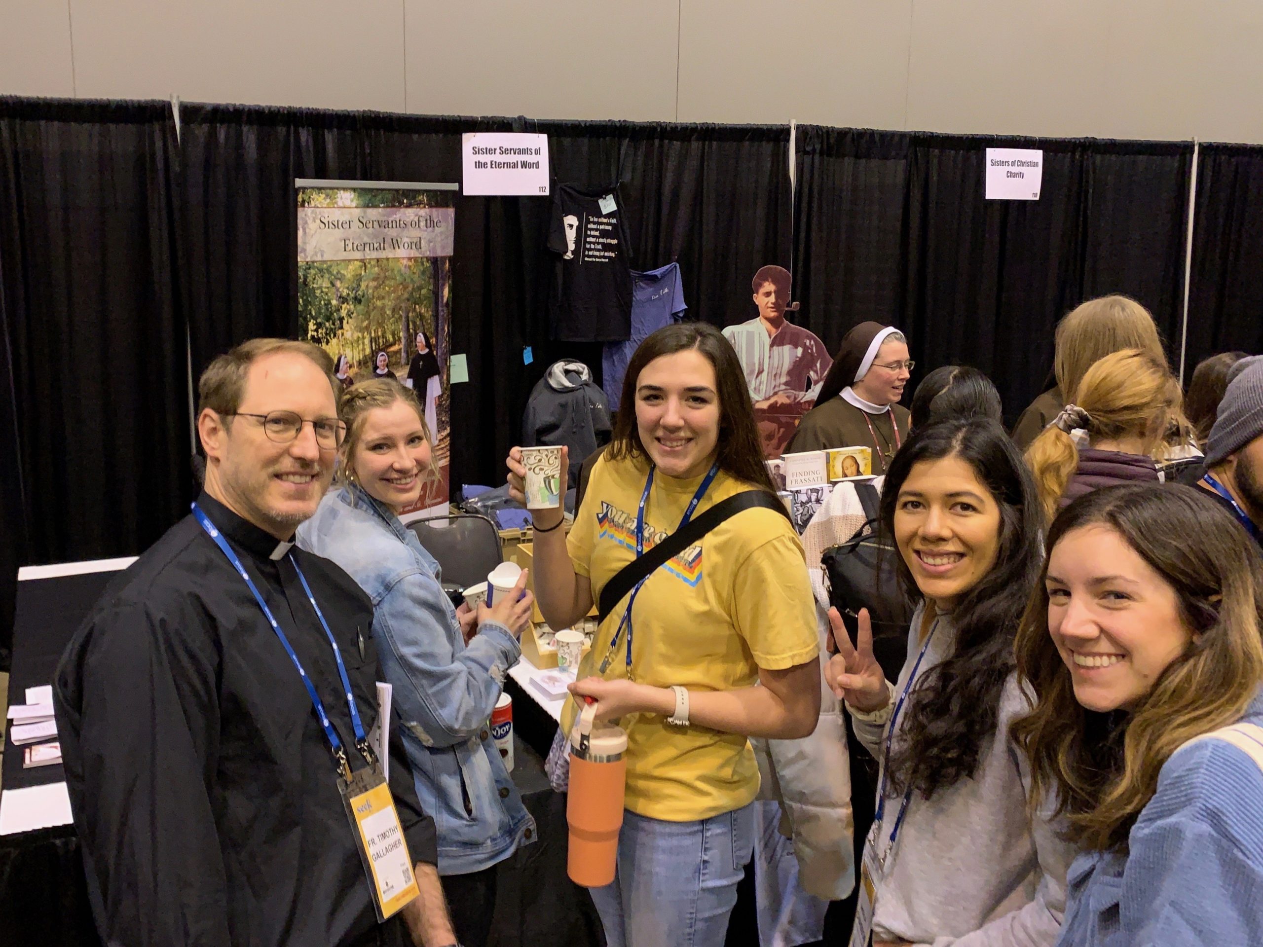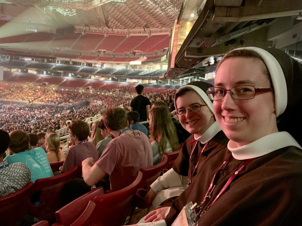 January 14, 2023 The Sisters at SEEK ’23 At the beginning of January, seven Sister Servants traveled to St. Louis to attend the FOCUS SEEK conference, along with 17,000 other participants! Many attendees were college students and FOCUS missionaries from across the country, but there were also large numbers of FOCUS missionary alumni, priests and religious, as well as others who desired to share and deepen their Faith. University students from the diocese of Birmingham gathered (with a couple Sisters) for a photo for our Bishop Steven Raica What an experience, to participate in the Holy Mass with 17,000 people! We had an incredible week, fruitful in prayer, sacraments and fellowship, sharing our life and apostolate with many friends – both new and those we have met on campuses already visited. Mother Louise Marie, Sister Mary Philomena and Sister Madeleine Marie flew into St. Louis, while Sister Marie Therese, Sister Mary Faustina, Sister Mary Michael, and Sister Rose Marie trekked on the road with materials for our vocations booth and compact bookstore. Sister Madeleine Marie was also asked to share her story, as a St. Louis vocation, and tell about our community on Roadmap to Heaven. Listen below! (Sister is interviewed in the middle section) At our booth, we offered free rosaries, medals, stickers, and coffee! We also brought a variety of bookstore items to offer for sale, including spiritual reading, Rosary booklets, Pier Giorgio T-shirts, and more. Pier Giorgio has been a great heavenly friend of our community, and always introduces us to new friends, as his story and our connection with Frassati USA bring up lots of questions, and requests for ‘selfies’ with his cutout! Each day, the Sisters were chiefly kept occupied meeting and building connections with various groups. We enjoyed meeting new friends amongst all the different groups, or running into familiar faces in the crowd. Our experience in St Louis confirmed the fruitfulness of our campus visits over the past two years. A busy moment in the vocations booths!Our friend Fr. Gallagher coming to visit with SEEK attendees over the coffeeTeaching about some of our favorites!Some of our booth- neighbors Highlights for the Sisters included the beautiful and carefully planned Eucharistic Liturgies – with over 400 priests and numerous bishops. What an incredible witness to Christ and His Church today! The daily procession at Mass was deeply movingGathering for prayer before the Entrance Procession Mother Louise Marie was moved to tears on entering the adoration chapel, seeing the number of seats provided, and knowing that it had been regularly filled to capacity during the conference. Wednesday evening included adoration in the stadium with a Eucharistic procession; during this time confessions were available late into the evening. We have all been inspired anew at this conference to “go and bear fruit that will last,” as we work in our apostolate to evangelize through catechesis and retreats!