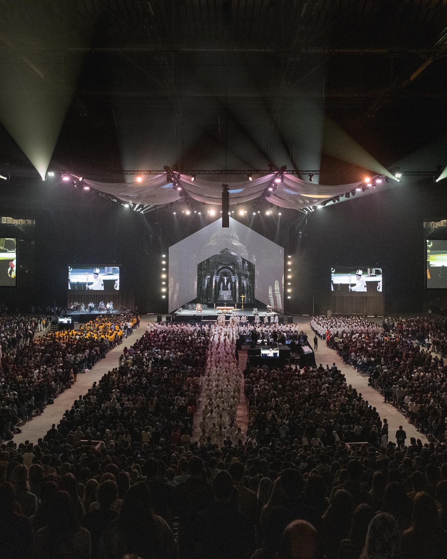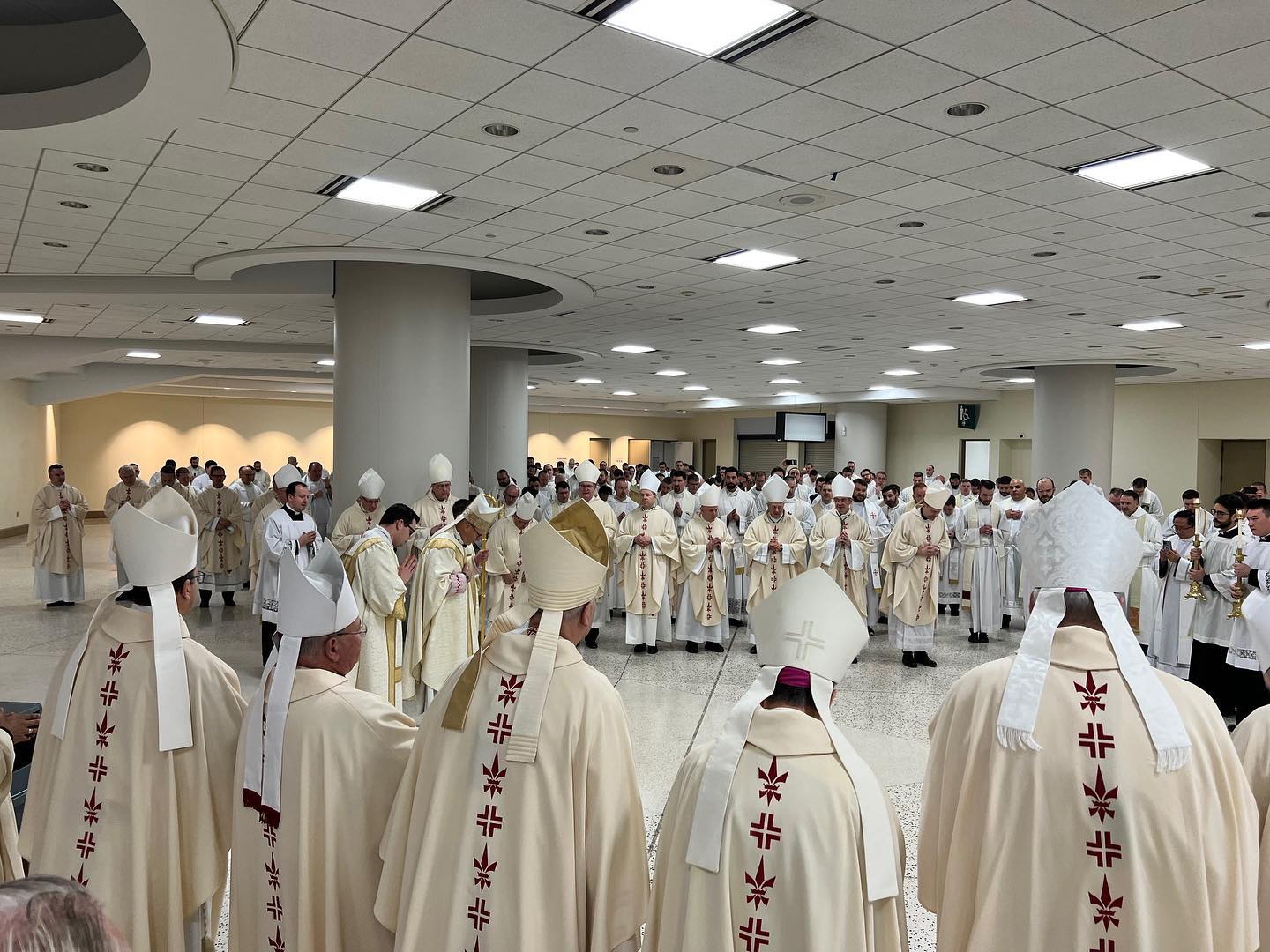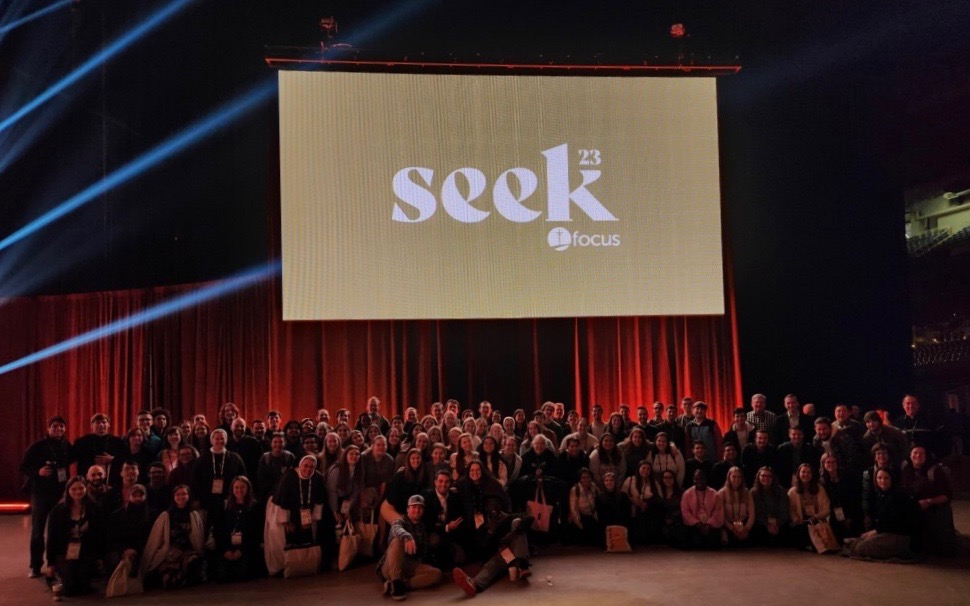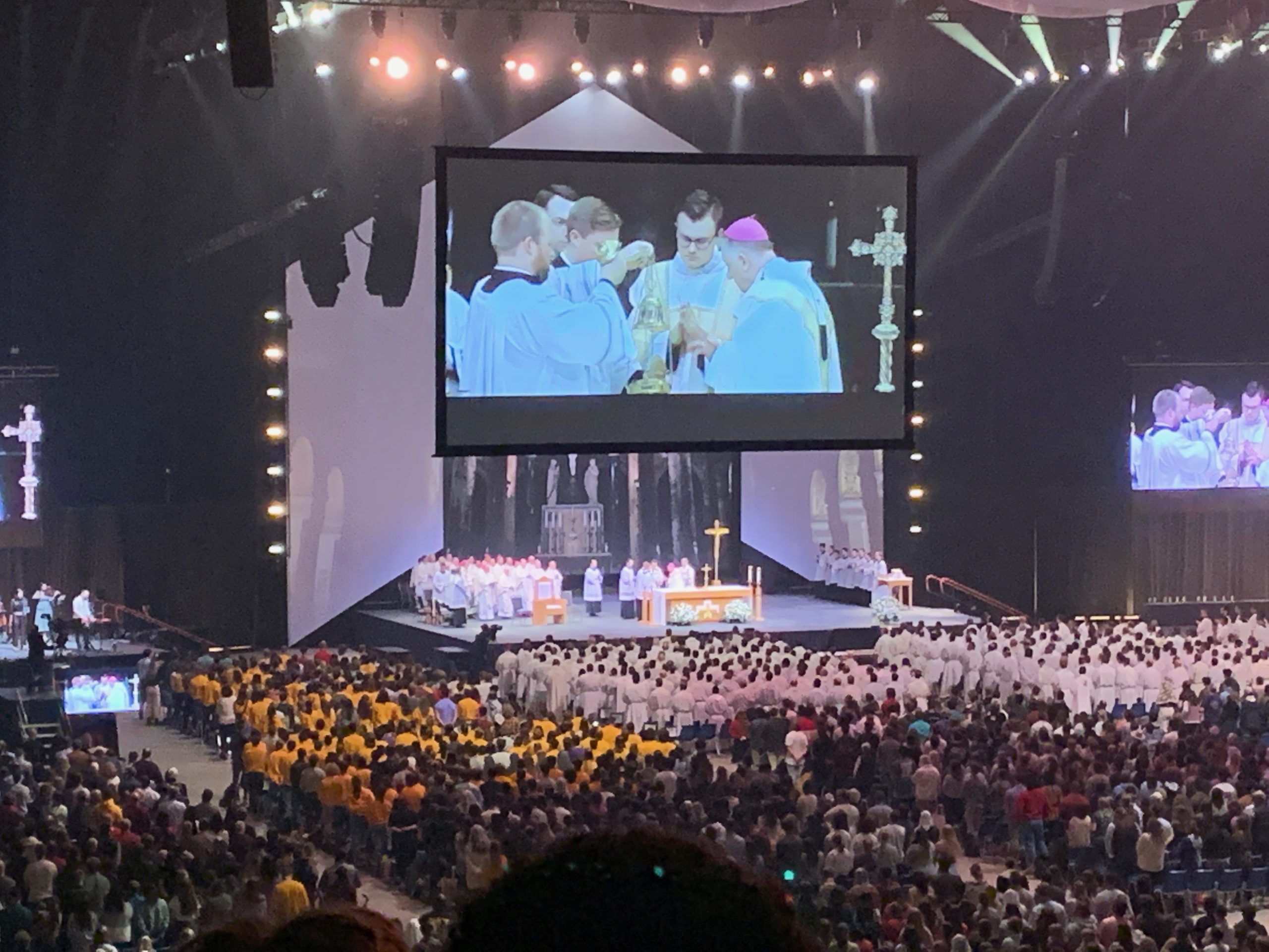 January 14, 2023 The Sisters at SEEK ’23 At the beginning of January, seven Sister Servants traveled to St. Louis to attend the FOCUS SEEK conference, along with 17,000 other participants! Many attendees were college students and FOCUS missionaries from across the country, but there were also large numbers of FOCUS missionary alumni, priests and religious, as well as others who desired to share and deepen their Faith. University students from the diocese of Birmingham gathered (with a couple Sisters) for a photo for our Bishop Steven Raica What an experience, to participate in the Holy Mass with 17,000 people! We had an incredible week, fruitful in prayer, sacraments and fellowship, sharing our life and apostolate with many friends – both new and those we have met on campuses already visited. Mother Louise Marie, Sister Mary Philomena and Sister Madeleine Marie flew into St. Louis, while Sister Marie Therese, Sister Mary Faustina, Sister Mary Michael, and Sister Rose Marie trekked on the road with materials for our vocations booth and compact bookstore. Sister Madeleine Marie was also asked to share her story, as a St. Louis vocation, and tell about our community on Roadmap to Heaven. Listen below! (Sister is interviewed in the middle section) At our booth, we offered free rosaries, medals, stickers, and coffee! We also brought a variety of bookstore items to offer for sale, including spiritual reading, Rosary booklets, Pier Giorgio T-shirts, and more. Pier Giorgio has been a great heavenly friend of our community, and always introduces us to new friends, as his story and our connection with Frassati USA bring up lots of questions, and requests for ‘selfies’ with his cutout! Each day, the Sisters were chiefly kept occupied meeting and building connections with various groups. We enjoyed meeting new friends amongst all the different groups, or running into familiar faces in the crowd. Our experience in St Louis confirmed the fruitfulness of our campus visits over the past two years. A busy moment in the vocations booths!Our friend Fr. Gallagher coming to visit with SEEK attendees over the coffeeTeaching about some of our favorites!Some of our booth- neighbors Highlights for the Sisters included the beautiful and carefully planned Eucharistic Liturgies – with over 400 priests and numerous bishops. What an incredible witness to Christ and His Church today! The daily procession at Mass was deeply movingGathering for prayer before the Entrance Procession Mother Louise Marie was moved to tears on entering the adoration chapel, seeing the number of seats provided, and knowing that it had been regularly filled to capacity during the conference. Wednesday evening included adoration in the stadium with a Eucharistic procession; during this time confessions were available late into the evening. We have all been inspired anew at this conference to “go and bear fruit that will last,” as we work in our apostolate to evangelize through catechesis and retreats!