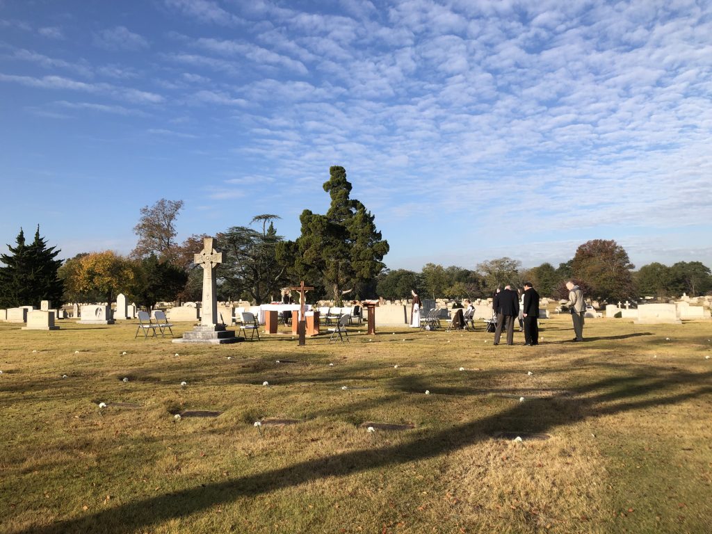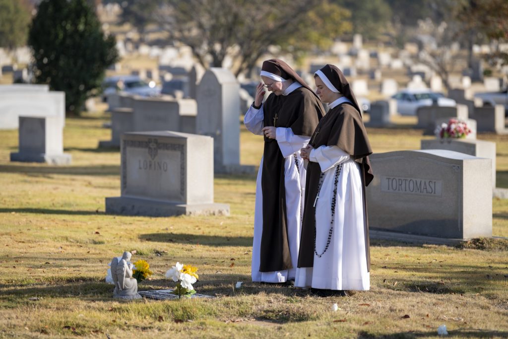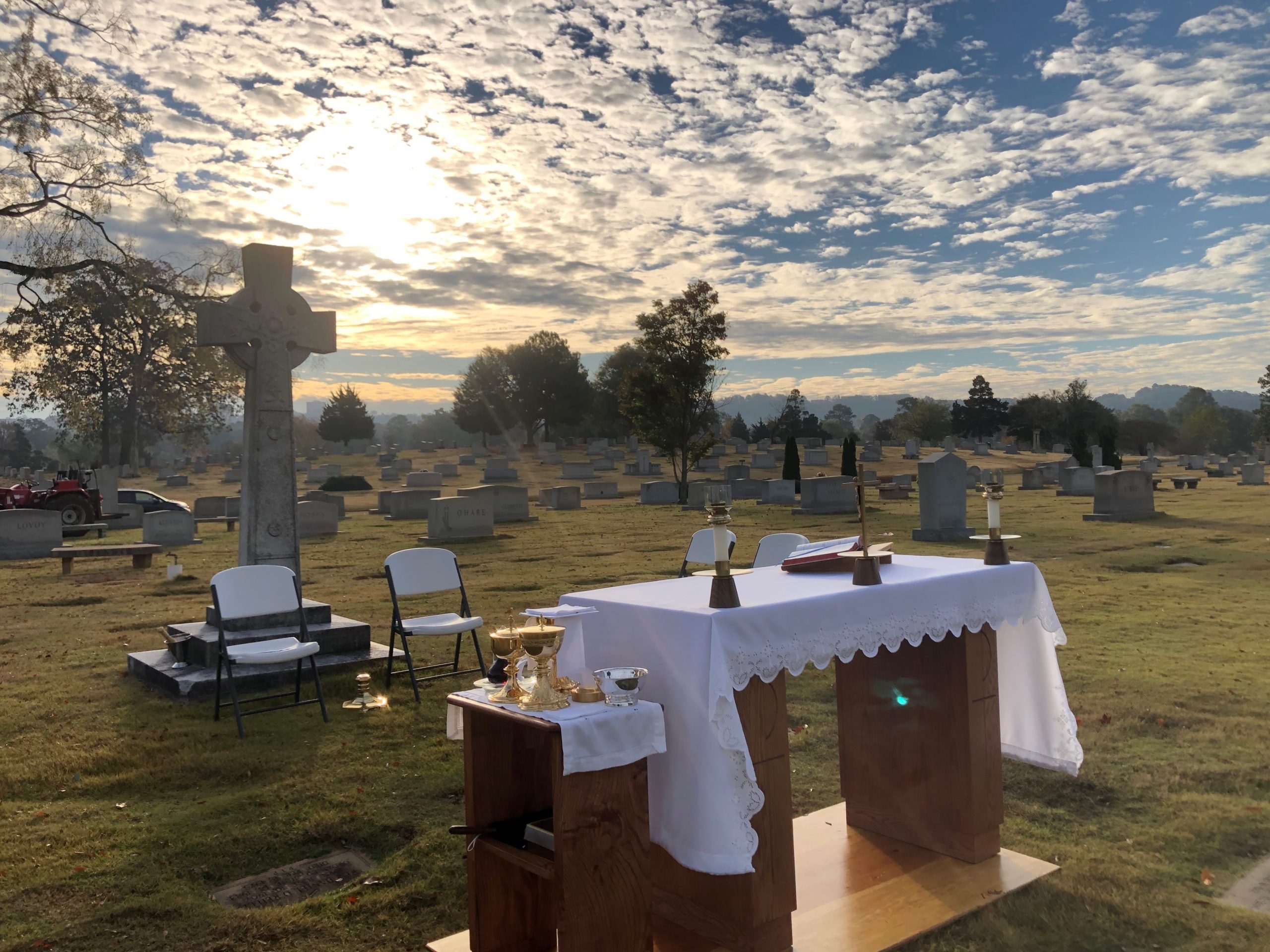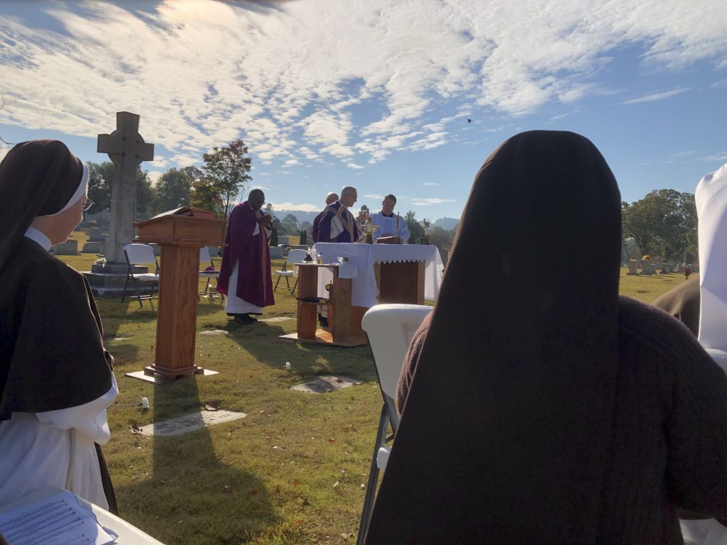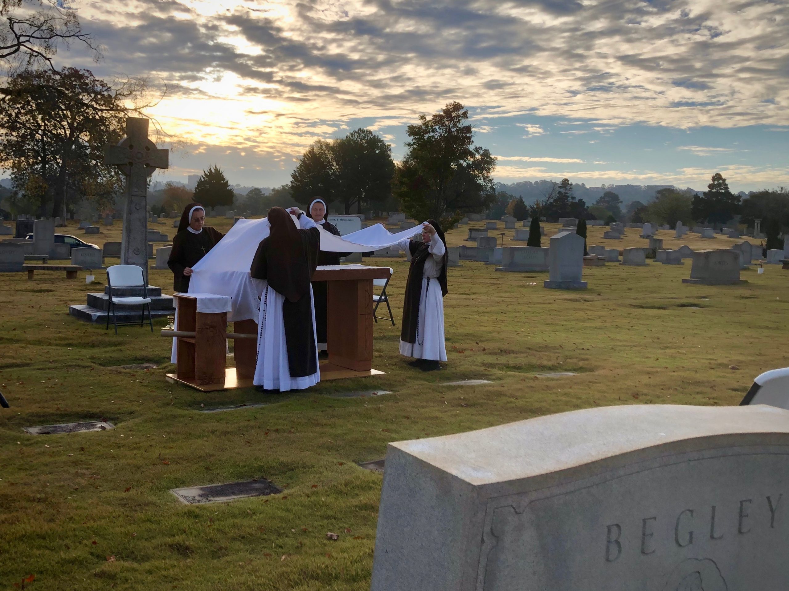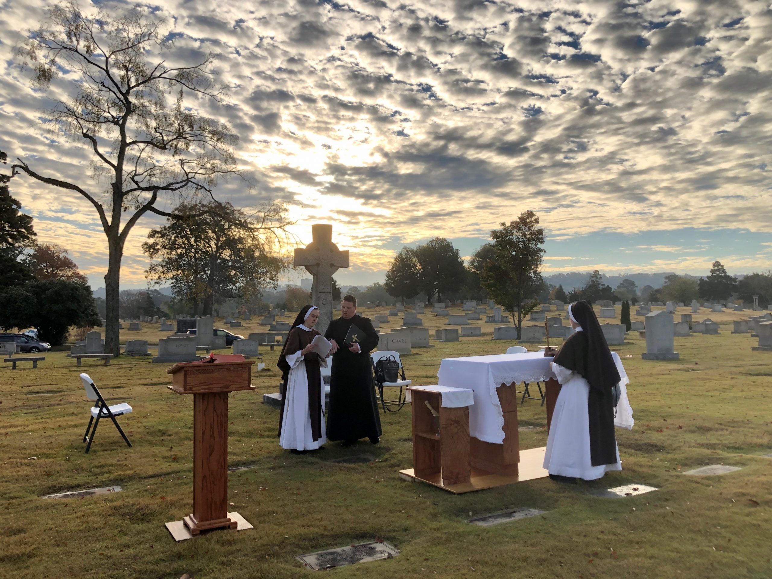 November 19, 2022 We Give Thanks – For Souls! (Photos are from the All Souls’ Day Mass celebrated by Bishop Raica at Elmwood Cemetery for the deceased priests of the Diocese of Birmingham. The Sister Servants were honored to provide the altar and all accompaniments for the Mass.) Praying at Father Lambert’s grave The month of November holds a special place for many, as the month dedicated to prayer for the Holy Souls in Purgatory. Half-way through the month, we are reminded to persevere in these prayers with the feast of St. Gertrude, who was especially devoted to them. Yet now at the end of the month, it is so easy to have our thoughts taken up with preparations for Thanksgiving! As reminders to be thankful start appearing, the two themes can be joined to make a beautiful opportunity for reflection. This Fall, our community has suffered the loss of some very dear, long-time friends, and the father of one of our Sisters. They will be much missed by us all. But their lives have given us so much to be grateful for! Such friendship, love, generosity, and examples of virtue and striving for holiness! Such dedication to God’s will and fidelity in following in His footsteps. We thank God for having been blessed to know such persons! And also, that once they have attained to the joys of Heaven, they will be mighty intercessors for us, the Church Militant. Each of the Priests’ graves were marked with a white flower As we approach the next few weeks’ festivities, let us pay our debts of friendship, and pray for the Holy Souls!