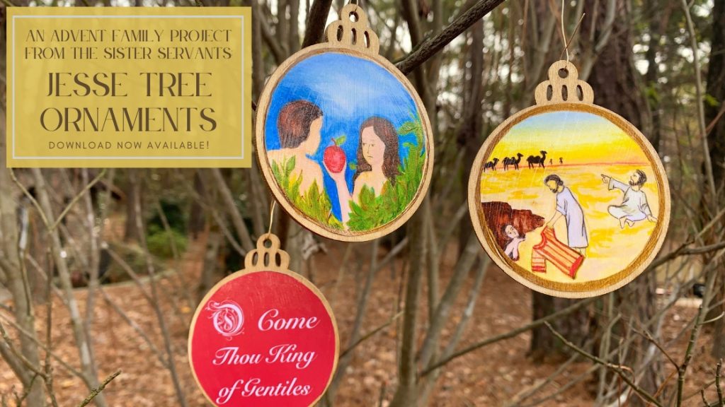 November 23, 2022 A Sister Servants’ Jesse Tree! After a hiatus of two and a half years, we resumed our weekly Come, Follow Me class at the convent in September. Come, Follow Me is a catechetical journey with young children that uses prayerful reflection and dialogue on the Scriptures to provoke a free response of the children to follow in Jesus’ footsteps as His disciples. The year is divided into three parts: Welcoming the Love of God, Living in Communion with Jesus, and Acting and Living as a Child of the Church with the Holy Spirit. For the past few weeks, we have been finishing up the first part of the year by looking at the History of the People of God, particularly through the figures of Abraham, Moses, Samuel and David. Each lesson includes a practical activity that reinforces the session and gives the children both something to help them grow in their private and family prayer life. This past week’s lesson coincided with the Feast of Christ the King, and we talked about Samuel being called by God to go to Jesse’s house in Bethlehem to anoint the future King of Israel (cf. 1 Sam 16). We discussed how Jesus, the descendant of David, is the true King sent by God to His people to be not only the king of the universe but also the King of our hearts. As I planned this lesson, I thought of the Jesse Tree, a custom I first learned about in the first grade at my parish grade school. I looked around at various sets available, and I asked Sr. Ave Maria if she could make a set based on the reflections found in Sara Estabrook’s The Mosaic Jesse Tree. Different sets of ornaments highlight different aspects of salvation history, and I chose these because it included meditations on the “O Antiphons” during the last days before Christmas–a particularly Catholic touch that also ties this practice into our liturgical life and customs at Casa Maria. This set’s meditations also take the Old Testament figures and relates them directly to the person of Jesus. In our life as Sister Servants, we can attest to how a renewed study of Salvation History completely changes the way we approach Christmas. The tradition of the Jesse Tree does just that. Each day of December, the child or family reads about one part of Salvation History leading up to the birth of the Savior. Often the Jesse Tree is a dead tree branch symbolizing Isaiah’s prophecy of the shoot that will spring up from the stump of Jesse (Is 11:1). Though this tree (or branch) looks dead, it is the instrument God will use to bring forth a curious sequence of events, making way for the greatest Event of all: the Incarnation and Savior’s birth. Familiarity with the ups and downs of Israel–their hopes and failures, God’s promises and the Chosen People’s anticipation–gives us a greater appreciation of God’s great gift of His own Son at Christmas. As a gift to you, we wanted to make a PDF of Sr. Ave Maria’s ornaments available to any families or individuals who are interested in adopting this custom. You can print your own copies to make your own ornaments with the matching name or Antiphon on its reverse side. If you are able, you may give a $5 contribution to help us make more resources like this available in the future. To download the instructions and Scripture passages that correspond to these ornaments, click here. When I made these with my students, we printed these using a good color copier and color printer paper (you can take these to a print shop for good results). I purchased these wooden ornaments in bulk and painted them with metallic gold spray paint (available at craft and hardware stores). Craft paint also works, but the spray paint had an even finish and was much faster. Using a foam brush, we applied a thin layer of Mod Podge to one side and attached the image to the ornament. To avoid bubbles, you will want to smooth out the paper. We repeated the same process on the other side with the matching name or description. When these dried, we put a thin layer of Mod Podge over the pictures, one side at a time. Note: this is a craft that is best done by 9 year olds and up, although our young students were able to do it (and had a great time doing so) with their parents’ help. If a child is doing this project, you may want to cover the workspace with a plastic bag or disposable table cloth and keep a damp rag nearby. Alternatively, while the PDF isn’t formatted to be printed double-sided, you could print them on cardstock, match up the two sides, and laminate them for sturdiness. You can then hang them with ribbon, yarn, or a string. We have heard that families have different ways of creating their Jesse Trees. Some arrange a fallen tree branch in a pot with rocks or sand, covered with a cloth. Others hang them from the Christmas tree before Christmas decorations go up. They can also be hung from a garland on a fireplace mantel or stair railing so that it becomes a timeline of Salvation History. We hope you get as much joy out of these miniature glimpses of Salvation History as we have! We pray for you and your families daily as you spiritually prepare for the coming birth of Our Lord!
