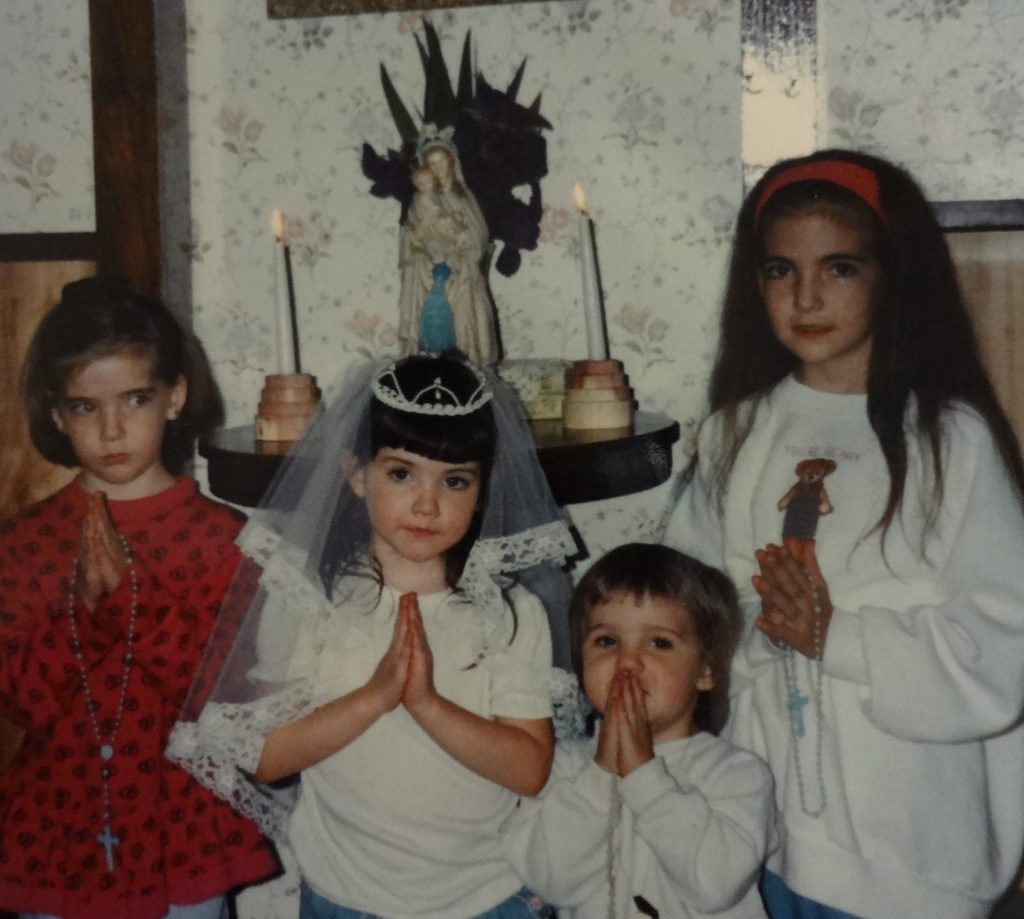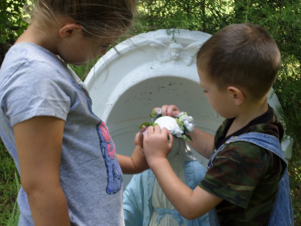 The statue would be brought out and one of us would get to place the crown on Mary’s head while we all sang, “Bring Flowers,” “Tis the Month of Our Mother” and any other Marian hymn of which we could remember a significant number of words (If you forgot part, you just hummed, or thought up other words that sounded relatively suitable). Then it was not uncommon to do it all over again, because somebody was sad that they hadn’t been chosen to crown Mary, so they had to have a turn. Over the years, as nieces and nephews came into the mix, we might crown Mary on several different days, sometimes at the May Altar, sometimes at the outdoor statue, with whichever bunch of kids was visiting. Sometimes we would pray the Rosary, sometimes other prayers, but we always sang, and we always brought flowers.