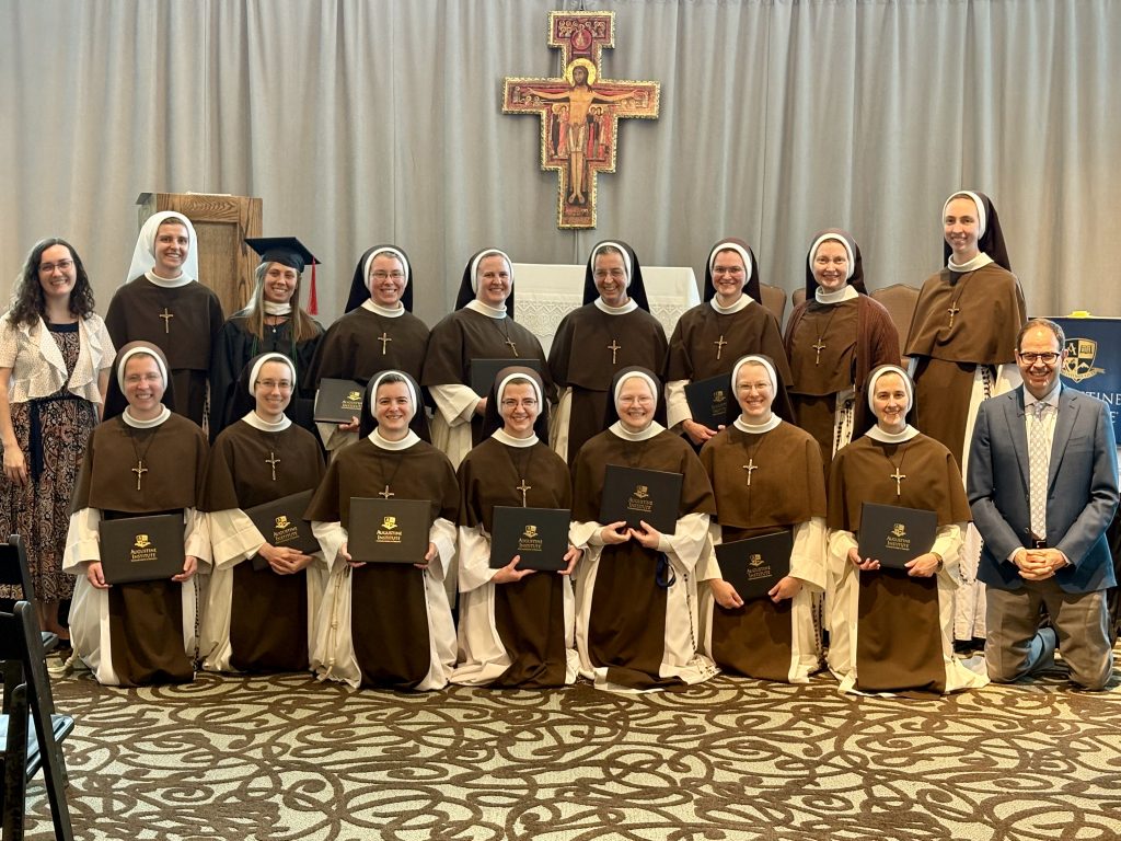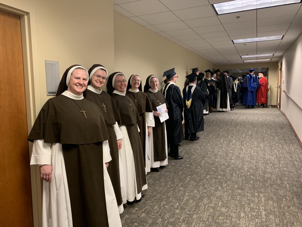 Fourteen Sisters have just returned from a very exciting trip to St. Louis – to participate in Augustine Institute’s first commencement ceremony on their new campus! Over the last several years, our Sisters have been working as a community to study Theology, and as the years have gone by, we have only been more and more impressed by the program, edified by the faculty, and grateful for the experience. Ten Sisters completed the coursework for credit and received their Master’s in Theology, but all the community participated as much as possible in the lectures, course reading, and many many conversations about coursework. It has absolutely been a community effort!
