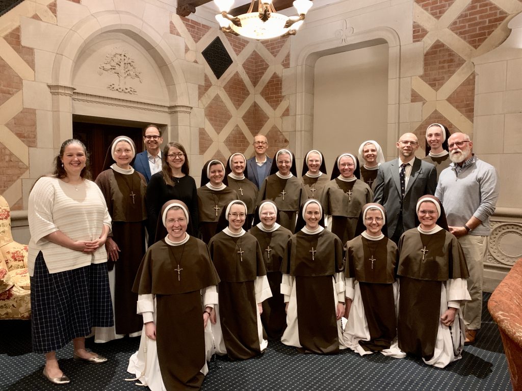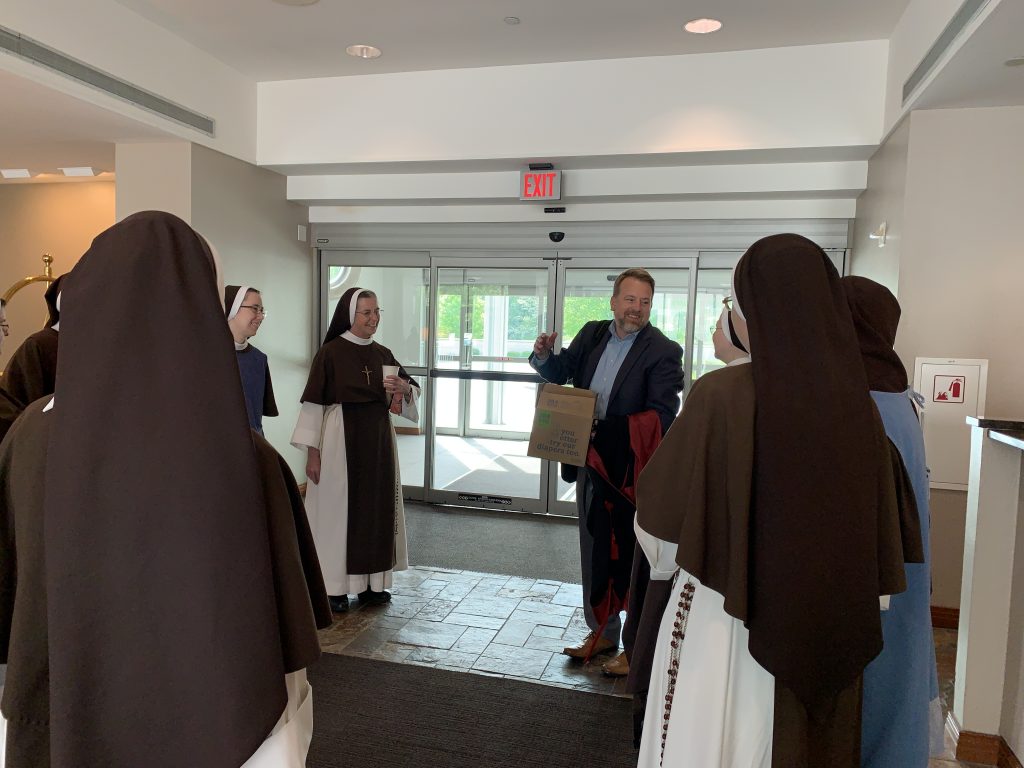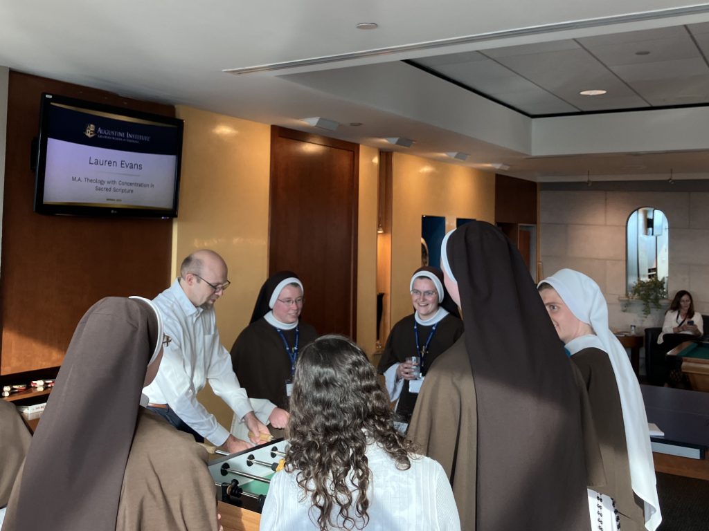 Fourteen Sisters have just returned from a very exciting trip to St. Louis – to participate in Augustine Institute’s first commencement ceremony on their new campus! Over the last several years, our Sisters have been working as a community to study Theology, and as the years have gone by, we have only been more and more impressed by the program, edified by the faculty, and grateful for the experience. Ten Sisters completed the coursework for credit and received their Master’s in Theology, but all the community participated as much as possible in the lectures, course reading, and many many conversations about coursework. It has absolutely been a community effort!