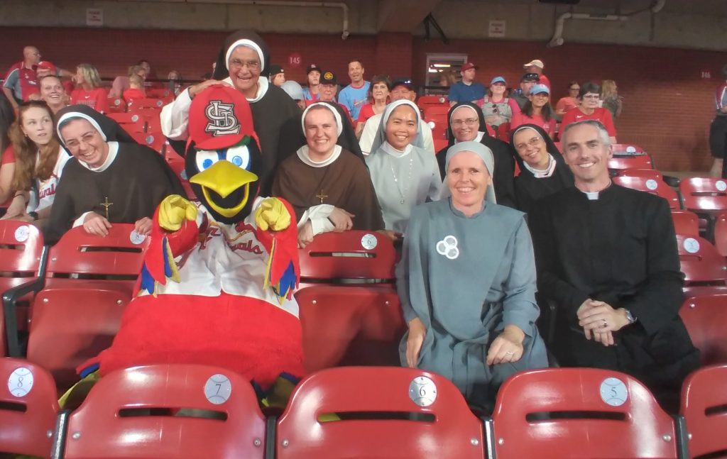 While we were in St. Louis, an opportunity arose to go to a Cardinals’ game with donated tickets, and we jumped on it! It was my first ballgame at Busch Stadium since 2006, and I was delighted that the Cardinals were just emerging from an extended slump. Our group included Fr. John Burns who spoke at the CMSWR meeting and 14 sisters from various communities. As the teams warmed up, Fredbird (pictured below) approached us, tipped his hat, and posed for a picture with us. It was a great game with great companions!